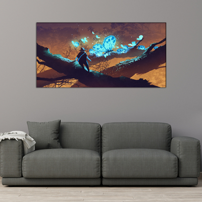 Man Looking at Blue Butterflies Canvas Wall Painting