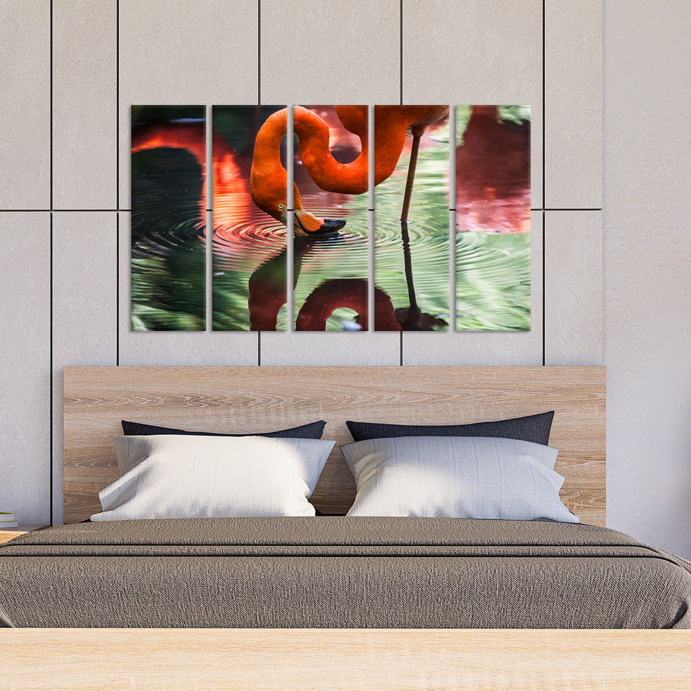 A Pink Flamingo Drinking Water Canvas Wall Painting - With 5 Panel