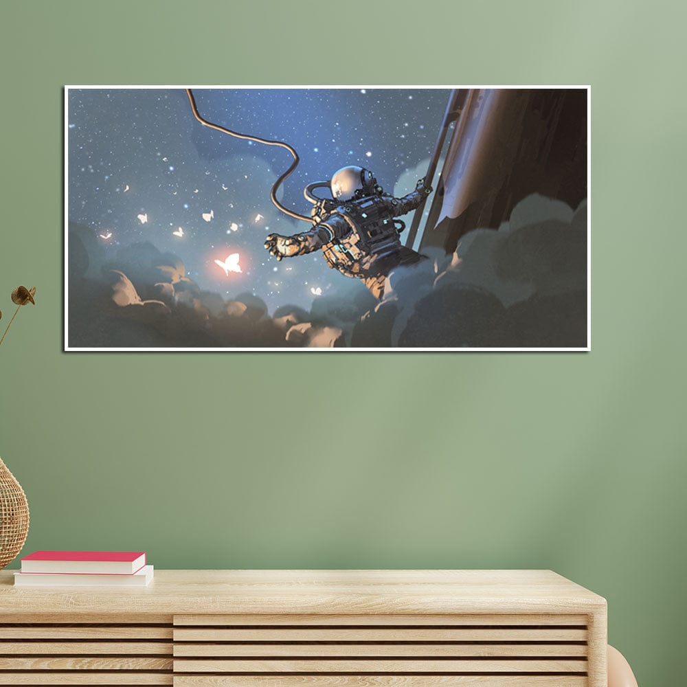 DecorGlance The Astronaut Catching The Glowing Butterflies Floating Frame Canvas Wall Painting