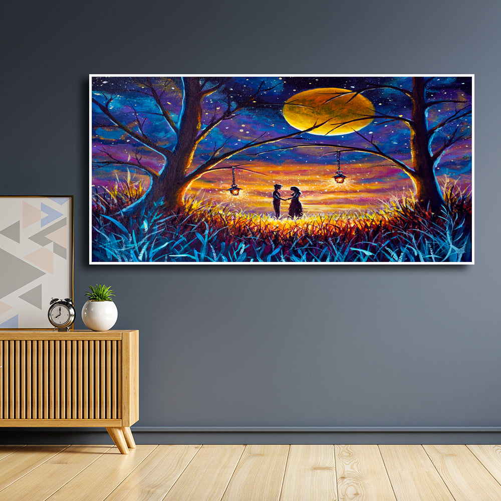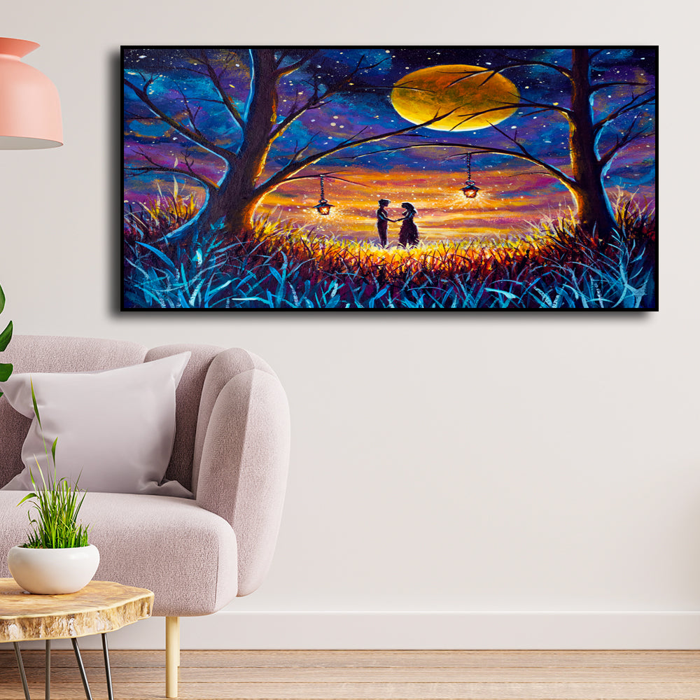 Couple In Forest At Night Under Moon Floating Frame Canvas Wall Painting