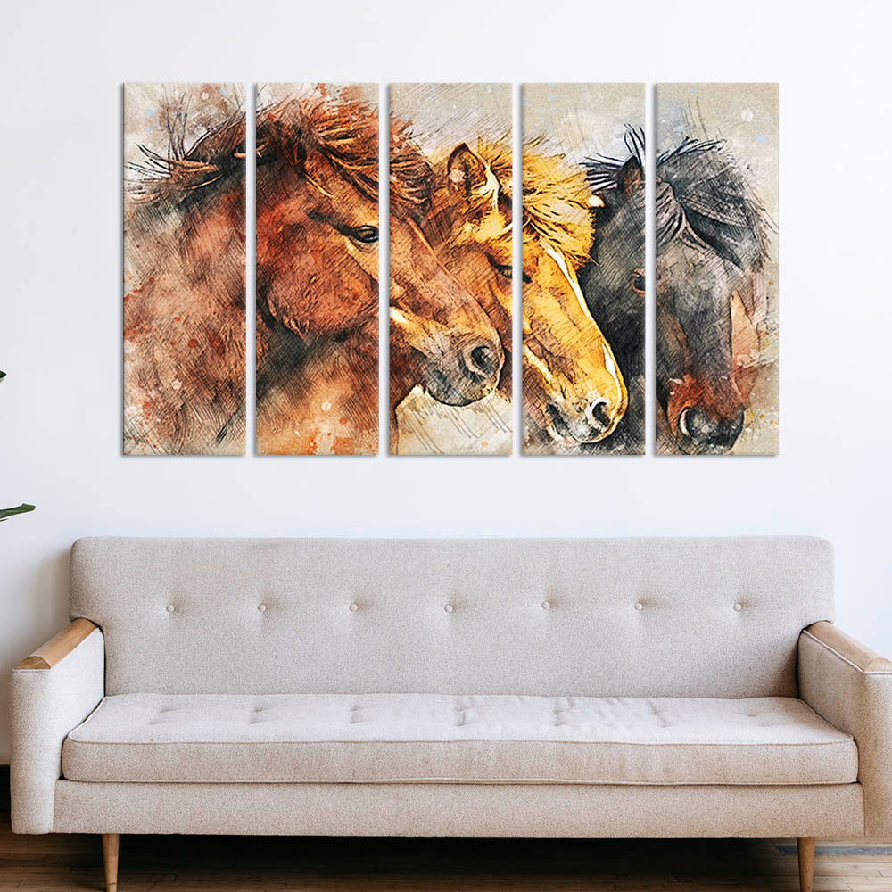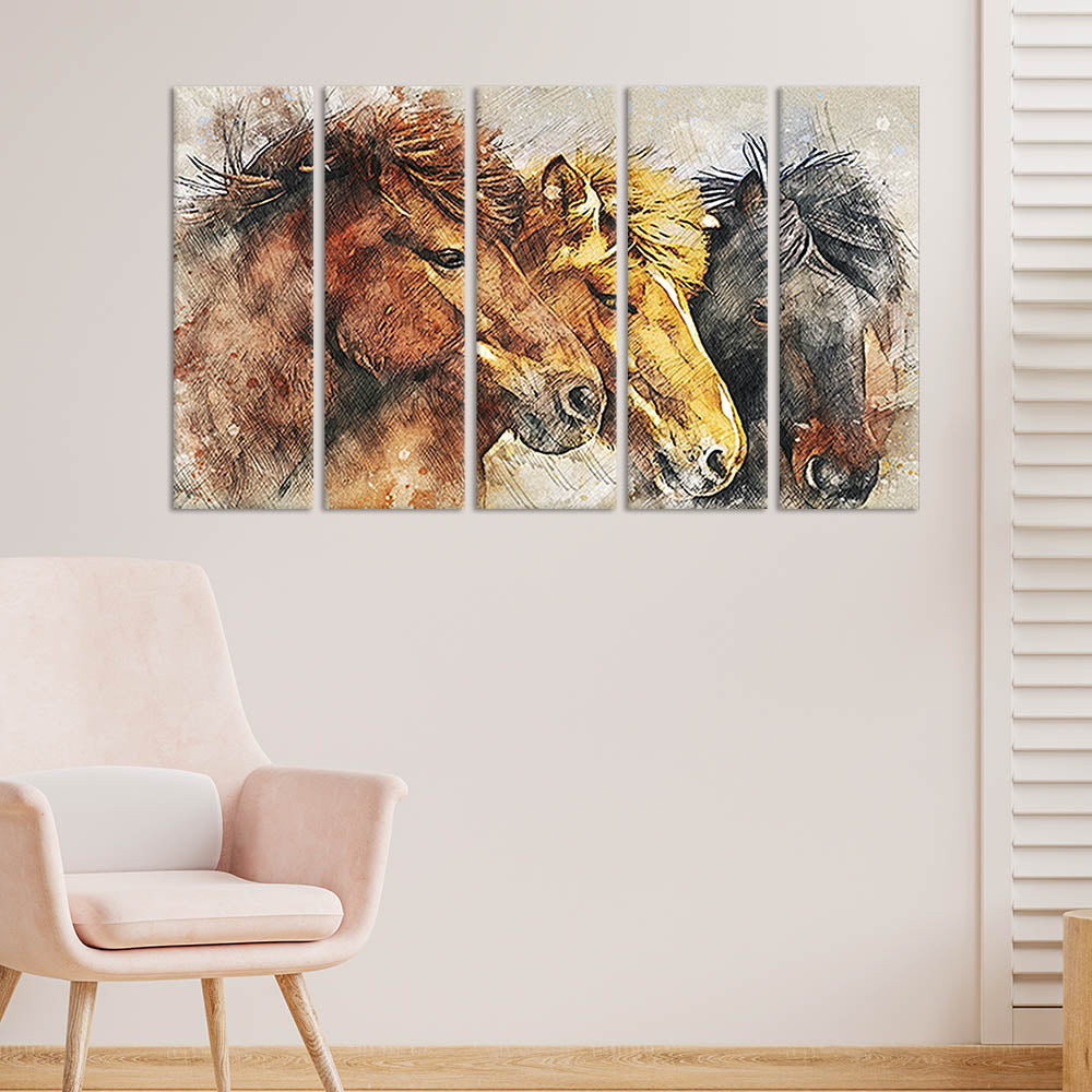 Colorful Three Horses Canvas Wall Painting - With 5 Panel