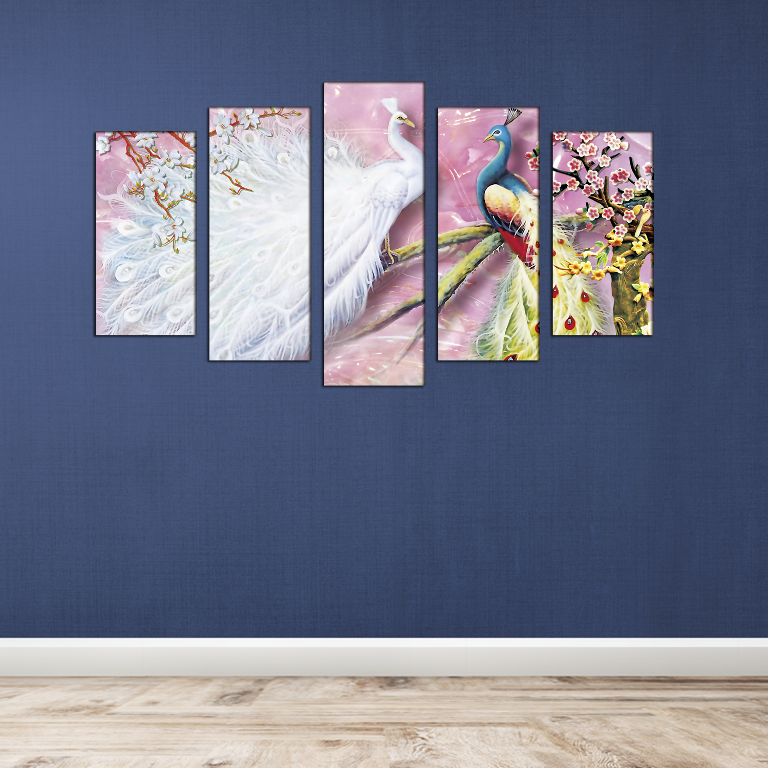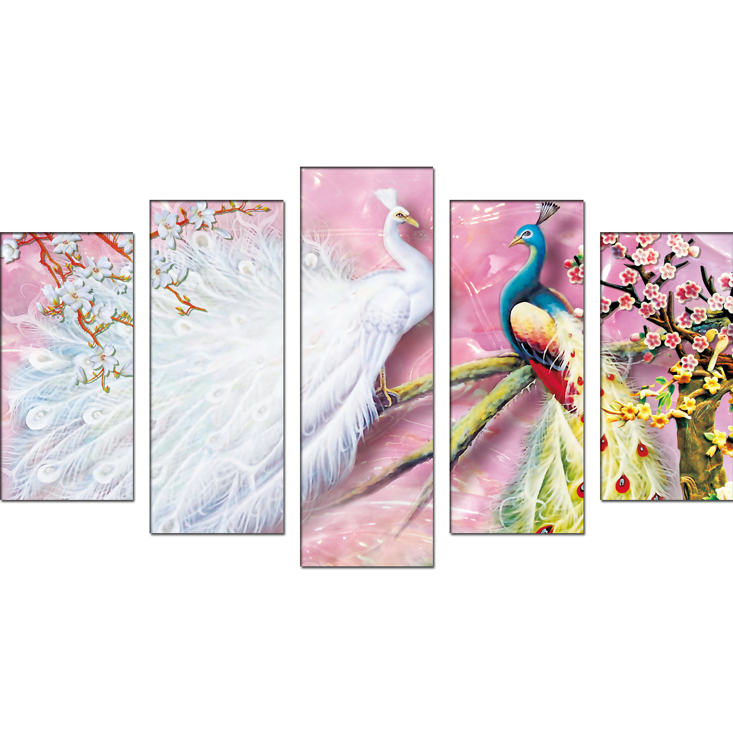 Beautiful white & Colored Peacock Canvas Wall Painting- With 5 Frames