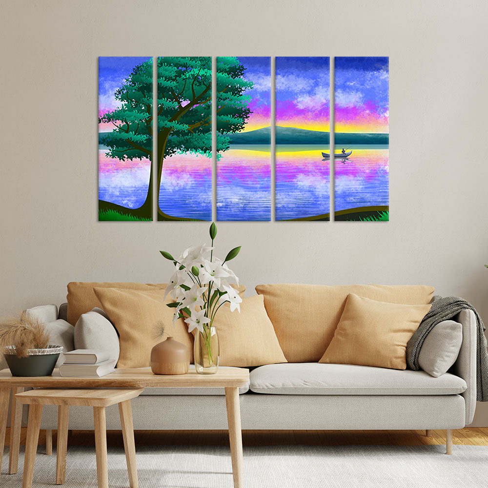 Abstract River Scenery View Canvas Wall Painting - With 5 Panel