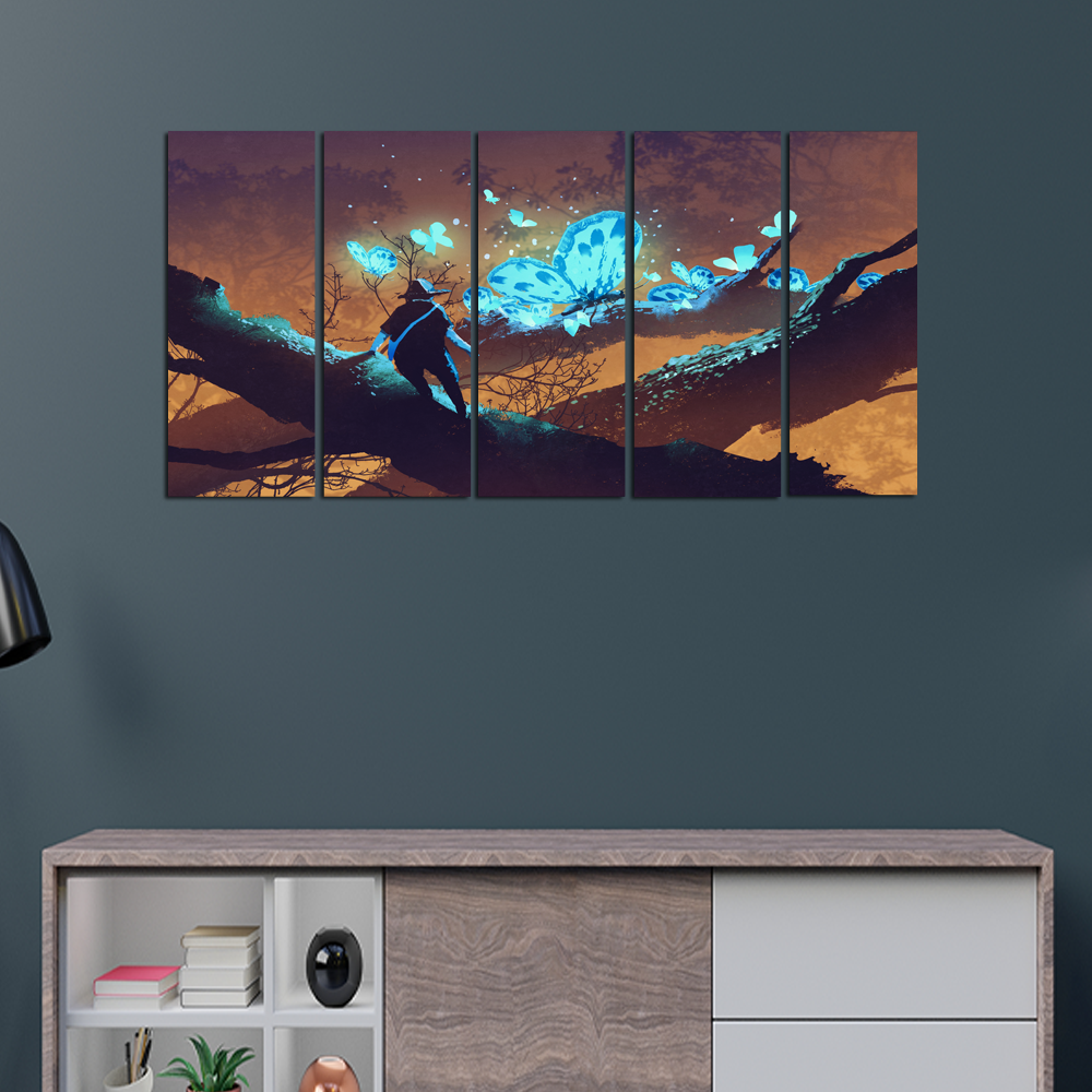 Man looking At Blue Butterflies Canvas Wall Painting -With 5 Panel