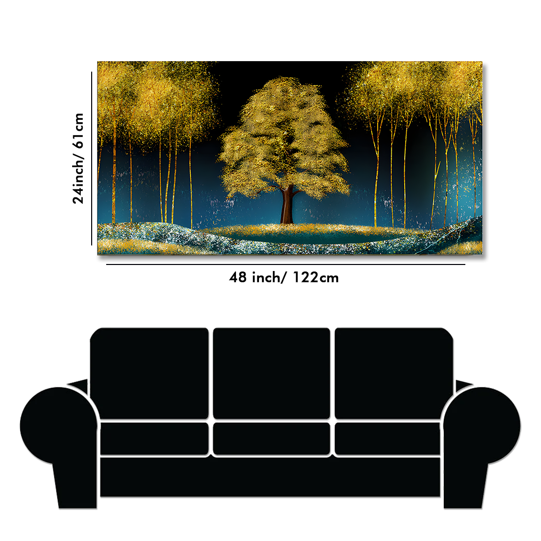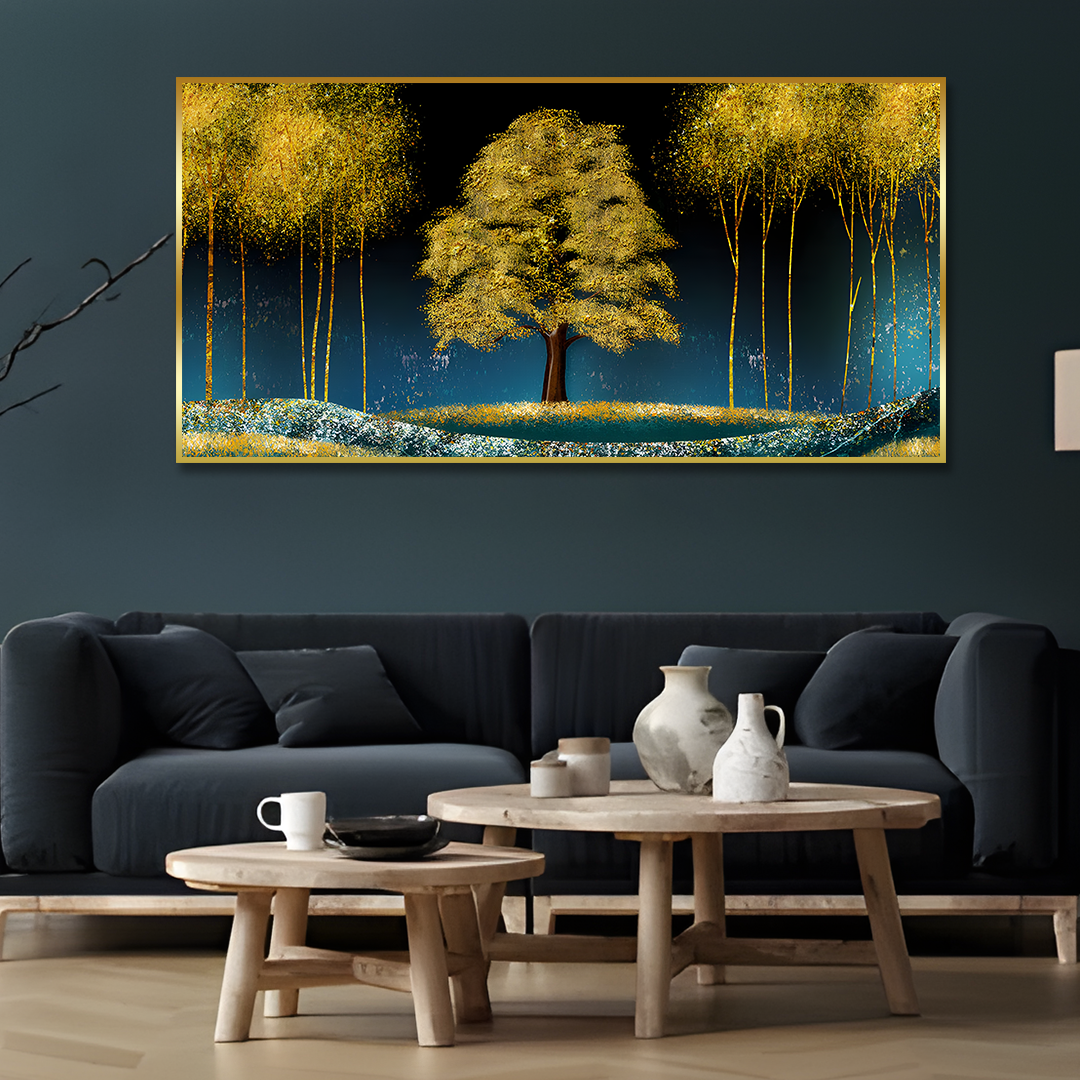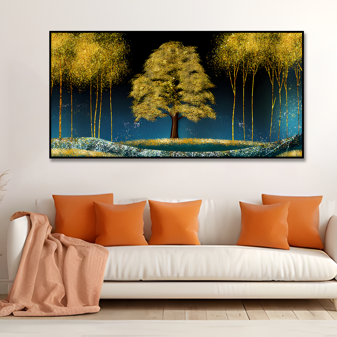 Beautiful Blue Sky and Golden Tree Canvas Floating Frame Wall Painting is a symbol of peace & prosperity. Fall in love with this beautiful and designer Abstract wall painting as a part of your home decor. Available in three canvas colors, it is a perfect living room painting that can completely change the look of your home. It is mounted on a strong and robust wooden frame which is made of American Pine thereby making it resistant to bending at corners due to the constant pressure of hanging on the wall. These canvas wall art are printed in HD quality and also use Eco-friendly inks that leave no residue or fumes in the environment around where it is put.