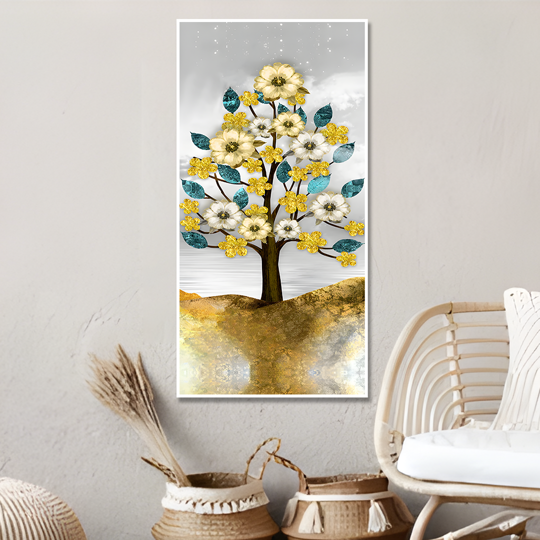 Beautiful Golden Flowers and Turquoise Mountains Floating Frame Canvas Wall Painting Golden Flowers Portrait Original Painting is a symbol of peace & prosperity. Fall in love with this beautiful and designer Golden wall painting as a part of your home decor. Available in three canvas colors, it is a perfect living room painting that can completely change the look of your home. It is mounted on a strong and robust wooden frame which is made of American Pine thereby making it resistant to bending at corners due to the constant pressure of hanging on the wall. These canvas wall art are printed in HD quality and also use Eco-friendly inks that leave no residue or fumes in the environment around where it is put.