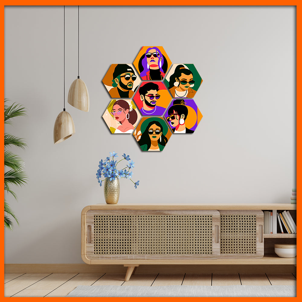 Beautiful Human Illustrative Face Hexagonal Canvas Wall Painting - 7pcs