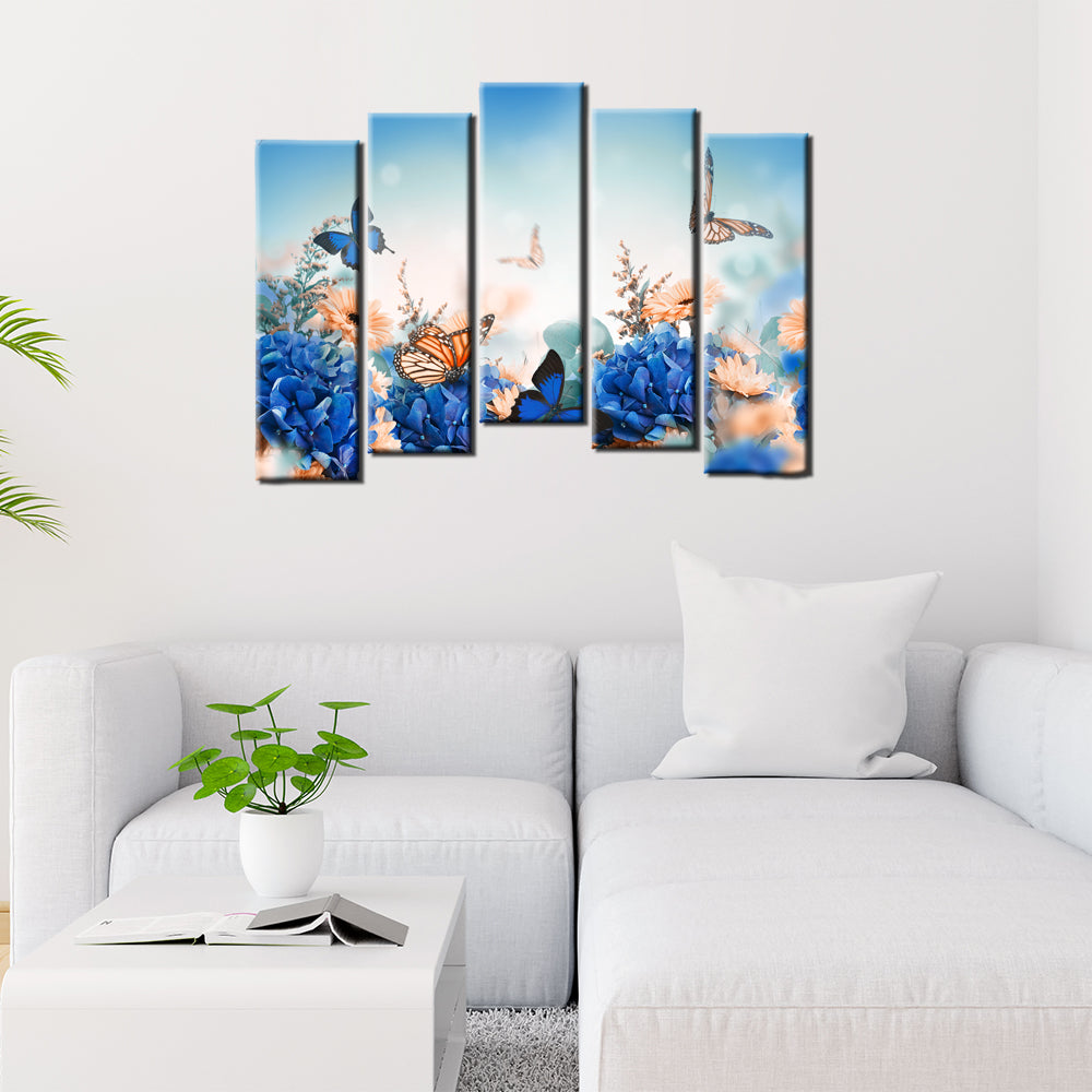Blue Flora Wood Framed Canvas Printed Wall Painting- With 5 Frames