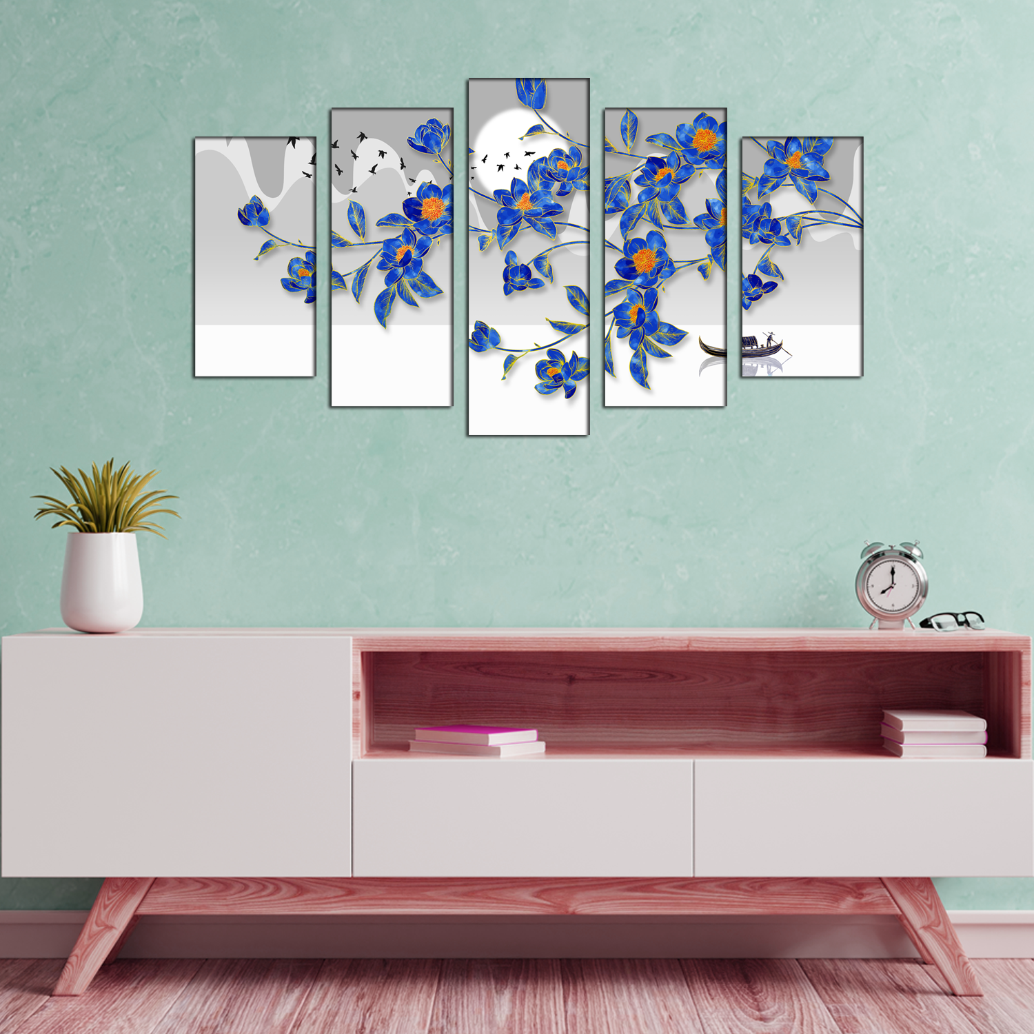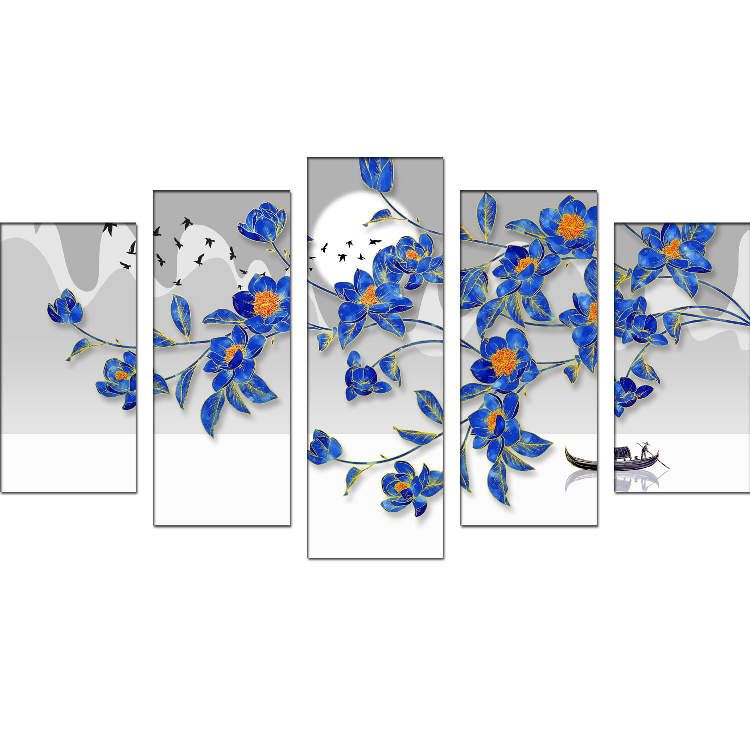 Blue Flowers & Flying Birds Canvas Wall Painting- With 5 Frames