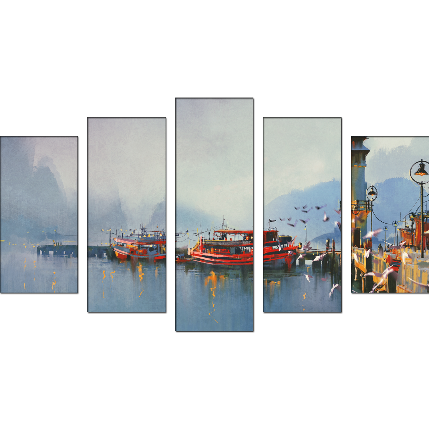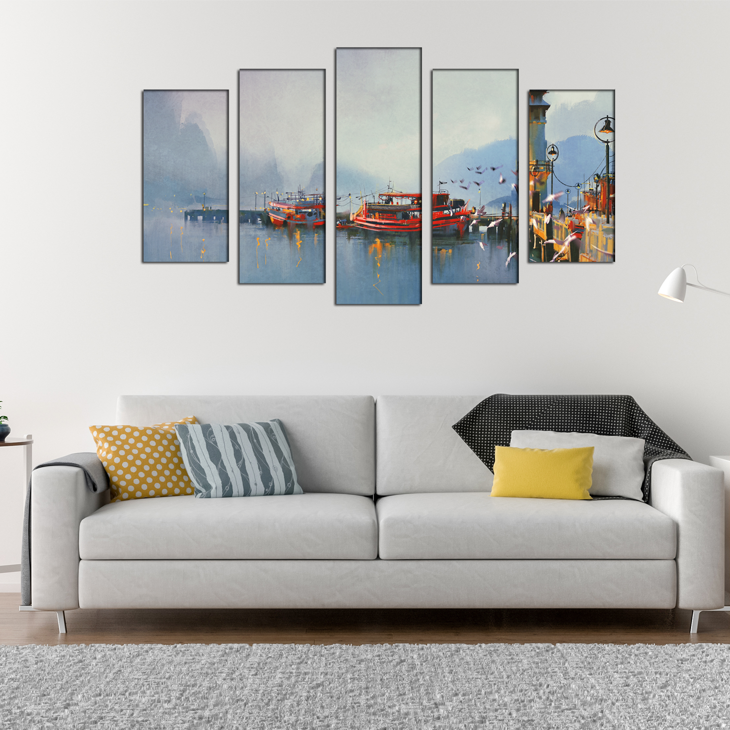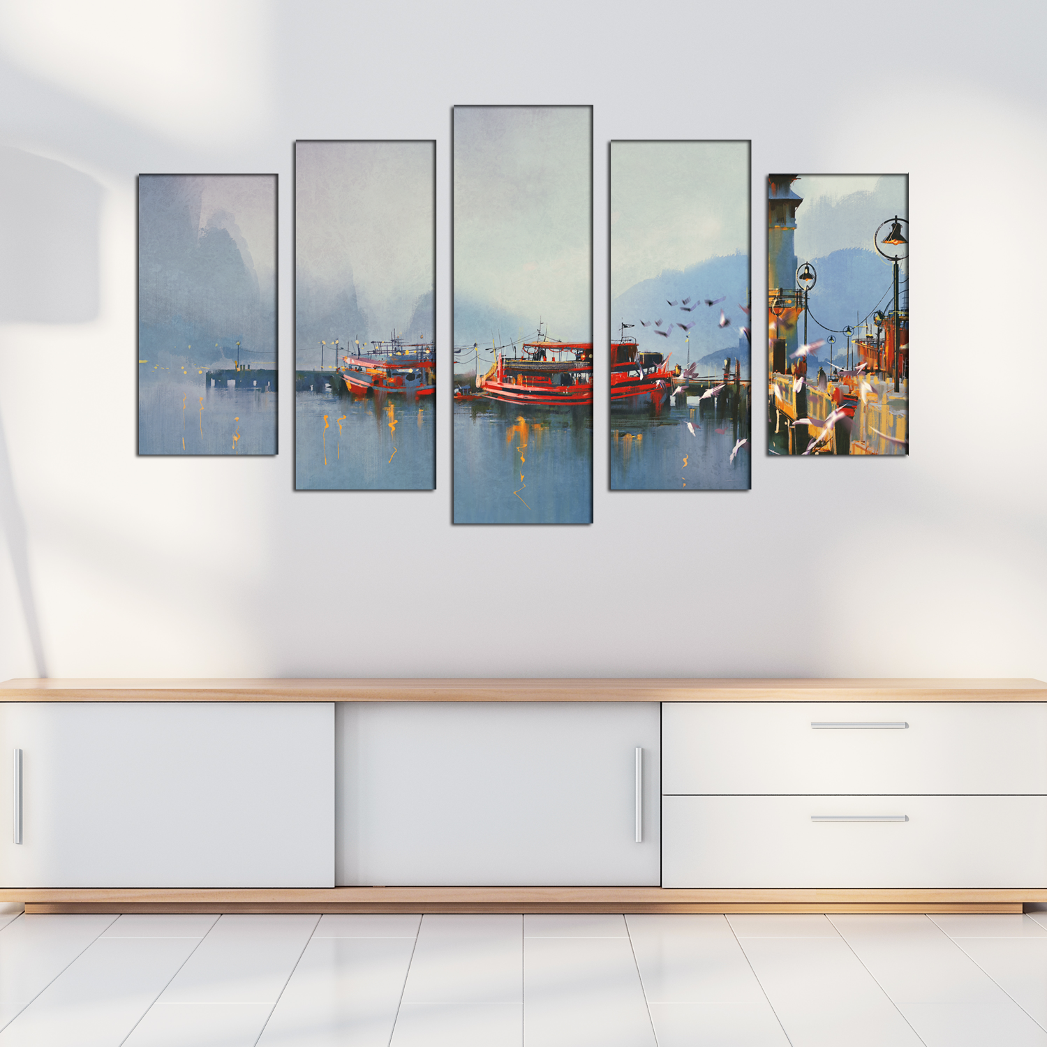 Fishing Boats In Harbor Canvas Panel Wall Painting - With 5 Frames