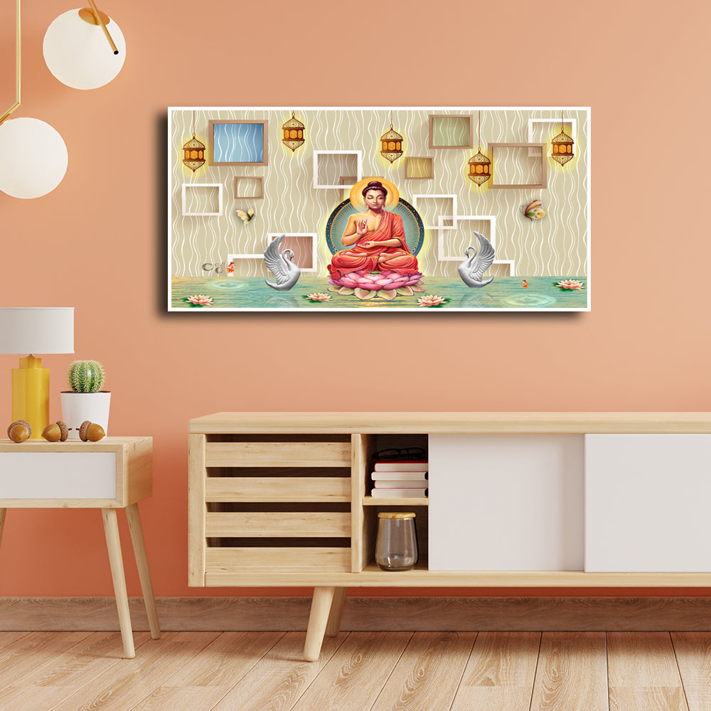 Buddha On Lotus With Swans Floating Canvas Wall Painting