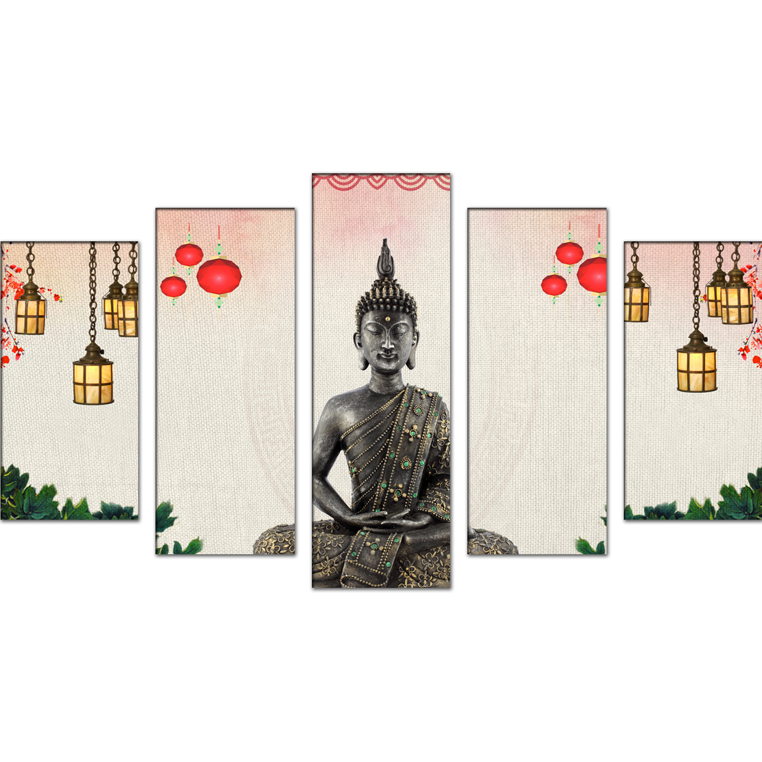 Buddha With Decorative Background Wood Framed Canvas Wall Painting- With 5 Frames