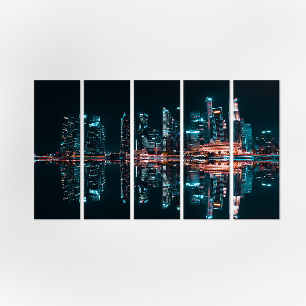 City Reflection At Night Canvas Wall Painting - With 5 Panel