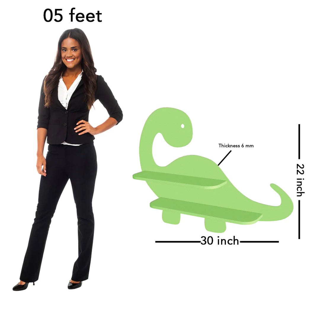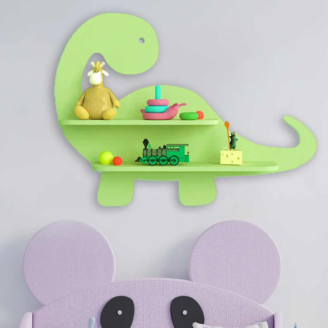 This exquisite Dinosaur-Shaped Kids Wooden Shelf brings unique decor to your bare walls with great utility. It is matte finished with White colour, made of imported Engineered wood. Ideal for living room, Bedroom, Study Room, and Kid's room. Can be used as Bookshelf, wall shelf, Toy shelf, showcase etc. The package includes all accessories like nails, wall plugs, and instructions needed to hang on a wall.