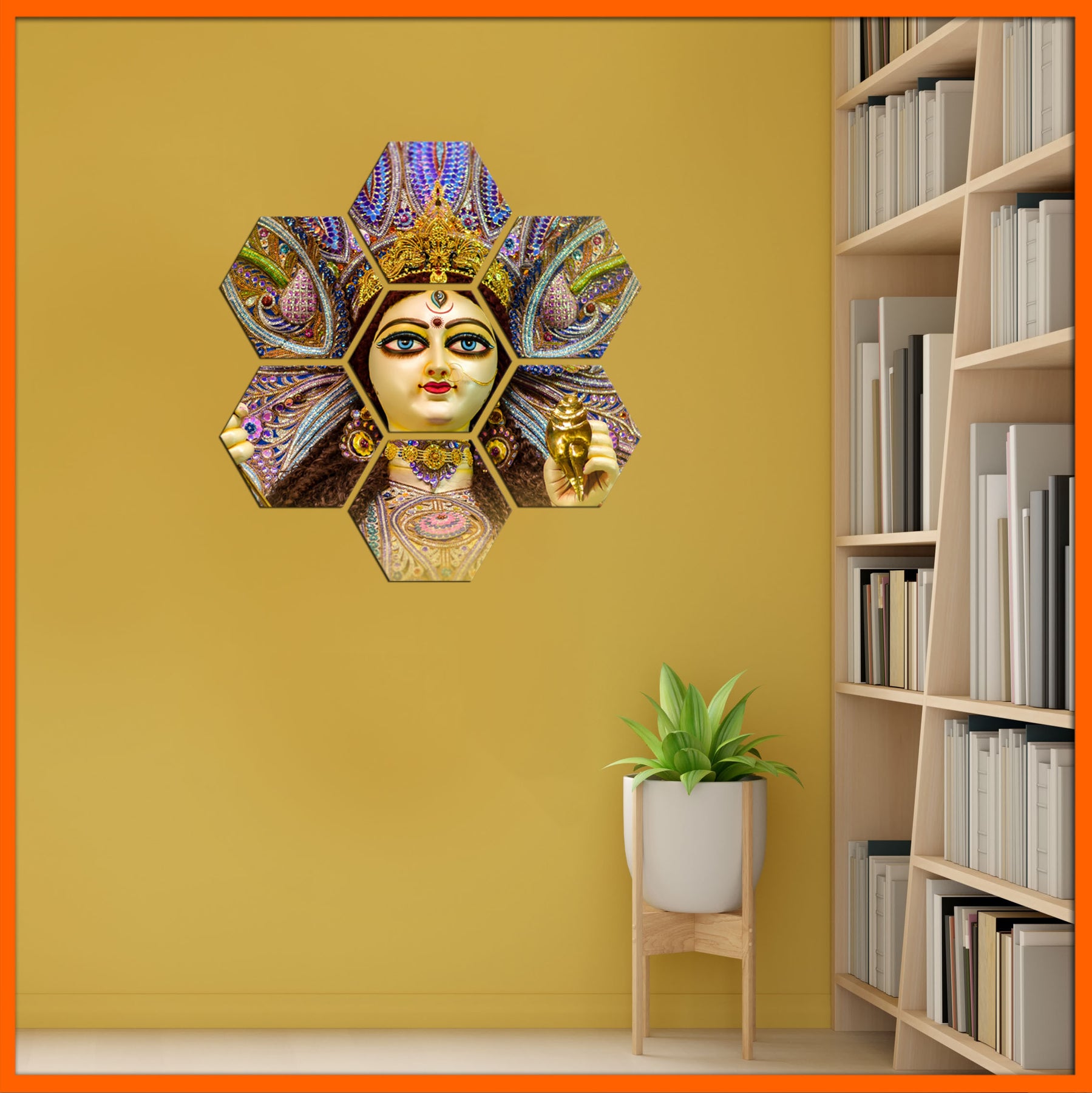 This beautiful and elegant Durga Maa hexagonal painting for wall décor is a high-definition design printed on an artist’s canvas. It is a set of seven divine honeycomb wall art modern décor pieces that will improve the look and feel of your house. Mounted on a strong engineered wood, this set of 7 hexagon prints can be placed strategically to form a big hexagon. You can hang it on your bedroom or living room wall to add a sense of spirituality and positivity to your home. Additionally, the painting can be gifted to your friend or family wishing them more power.