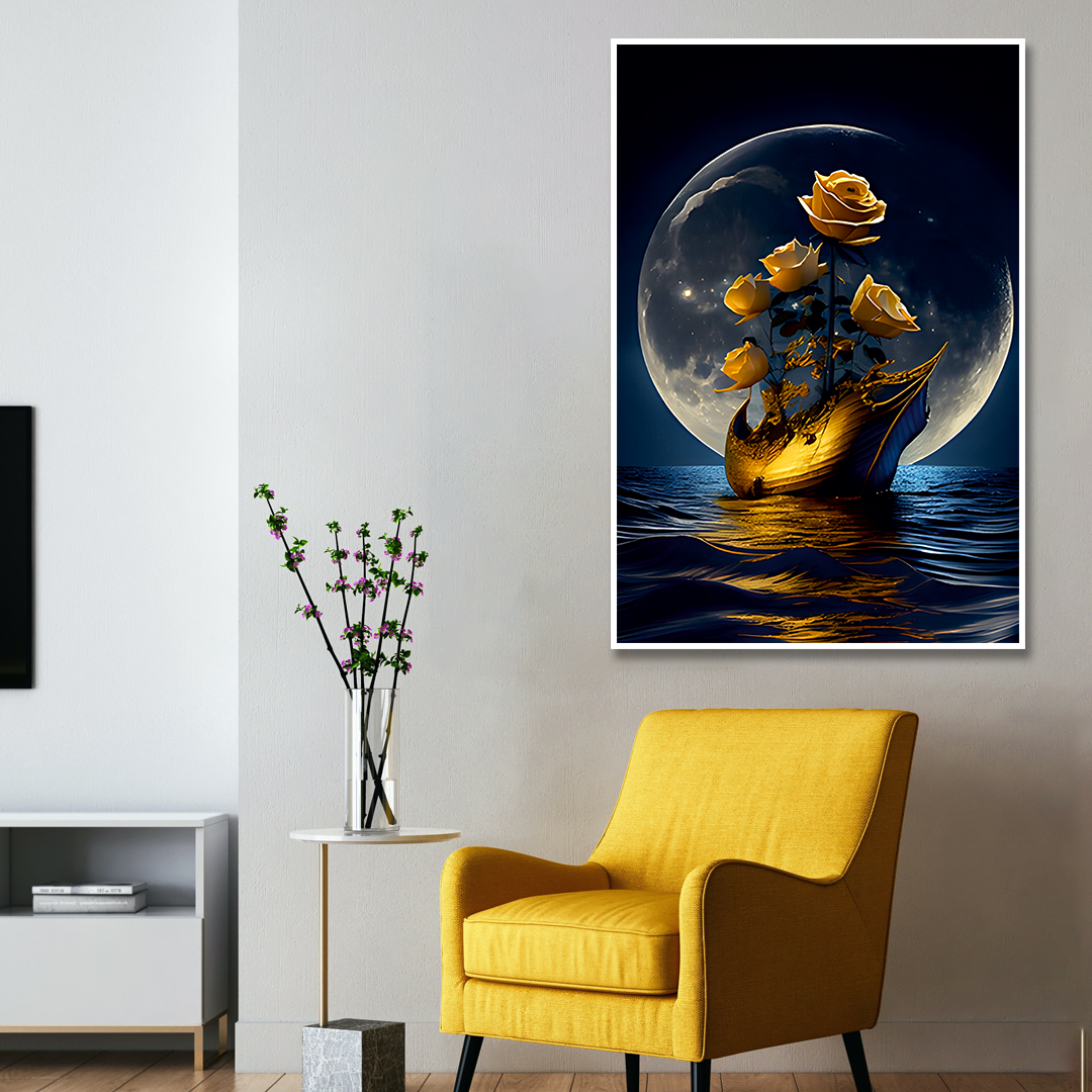 Full moon with sea, Golden boat and flowers Canvas Floating Frame Wall Painting is a symbol of peace & prosperity. Fall in love with this beautiful and designer wall painting as a part of your home decor. Available in three canvas colors, it is a perfect living room painting that can completely change the look of your home. It is mounted on a strong and robust wooden frame which is made of American Pine thereby making it resistant to bending at corners due to the constant pressure of hanging on the wall. These canvas wall art are printed in HD quality and also use Eco-friendly inks that leave no residue or fumes in the environment around where it is put.
