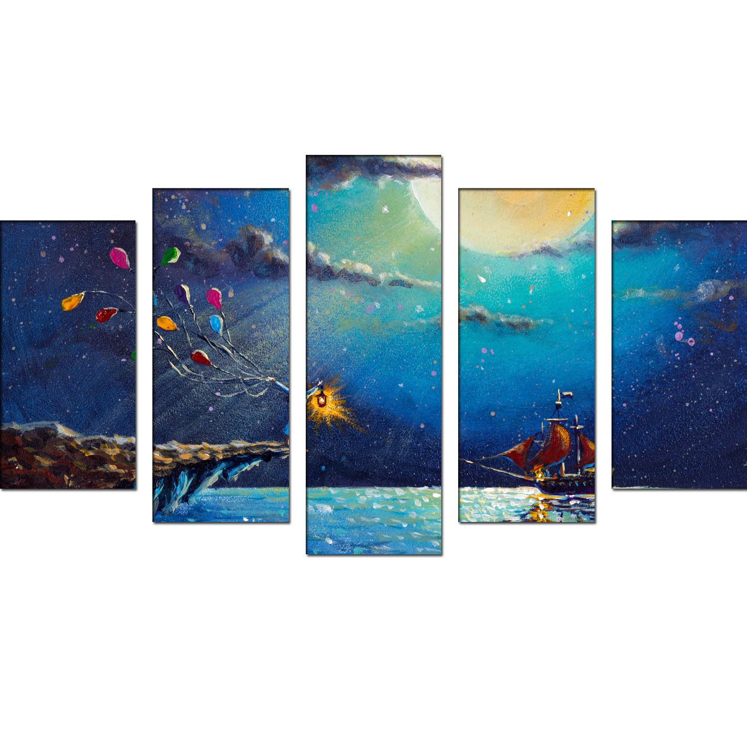 Boat & Girl Artistic Night Scenery Canvas Wall Painting- With 5 Frames
