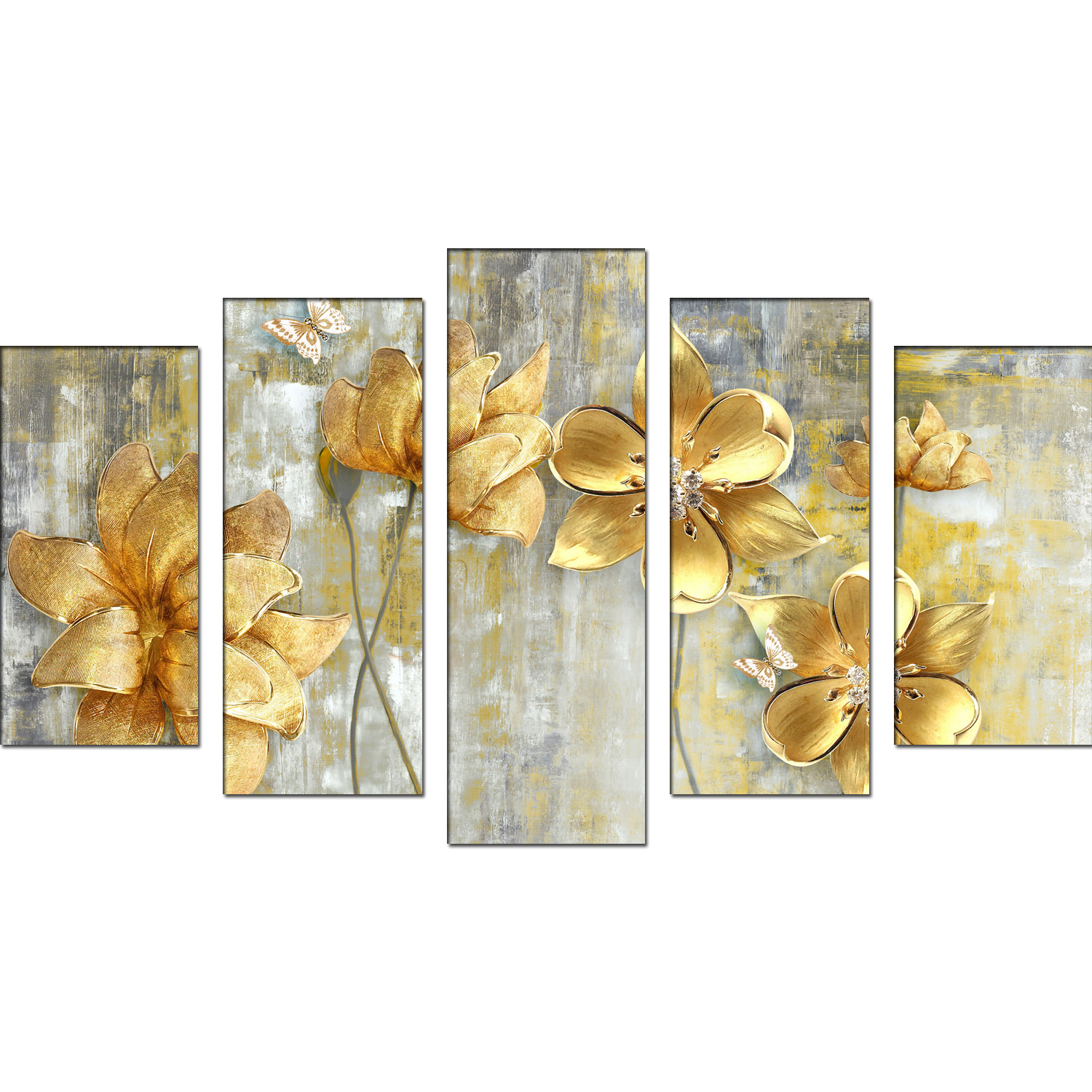 Golden Flower Wood Framed Canvas Wall Painting- With 5 Frames