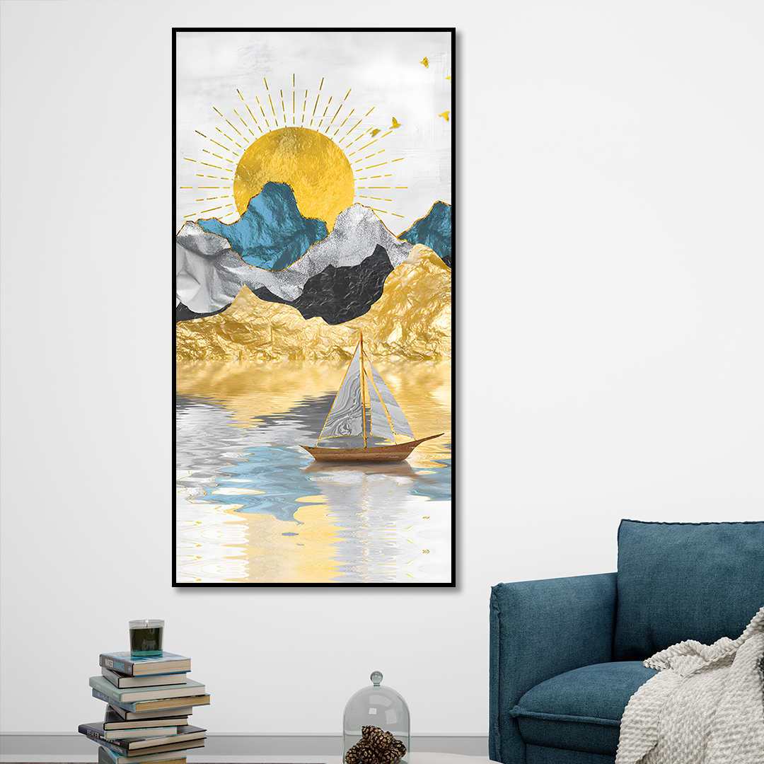 Golden Mountains and Beautiful Sunrise Scenery Floating Frame Canvas Wall Painting Portrait Original Painting is a symbol of peace & prosperity. Fall in love with this beautiful and designer Golden wall painting as a part of your home decor. Available in three canvas colors, it is a perfect living room painting that can completely change the look of your home. It is mounted on a strong and robust wooden frame which is made of American Pine thereby making it resistant to bending at corners due to the constant pressure of hanging on the wall. These canvas wall art are printed in HD quality and also use Eco-friendly inks that leave no residue or fumes in the environment around where it is put.