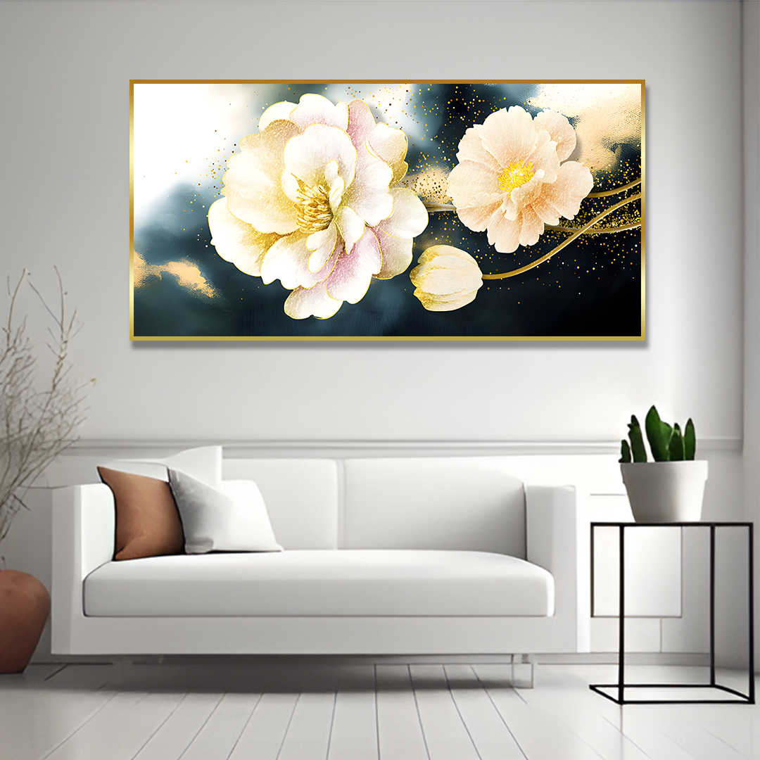 Golden Particles with Flower Premium Floating Frame Canvas Wall Painting Blooming Flower Landscape Original Painting is a symbol of peace & prosperity. Fall in love with this beautiful and designer Golden wall painting as a part of your home decor. Available in three canvas colors, it is a perfect living room painting that can completely change the look of your home. It is mounted on a strong and robust wooden frame which is made of American Pine thereby making it resistant to bending at corners due to the constant pressure of hanging on the wall. These canvas wall art are printed in HD quality and also use Eco-friendly inks that leave no residue or fumes in the environment around where it is put.