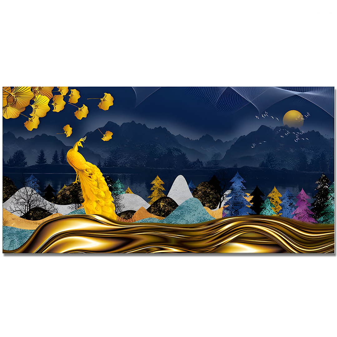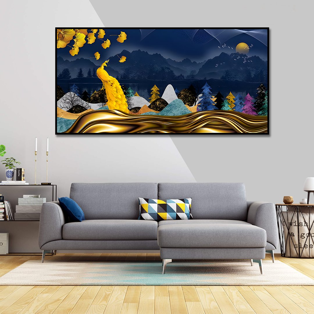 Golden Peacock in Dark Forest Premium Floating Frame Canvas Wall Painting Blooming Flower Landscape Original Painting is a symbol of peace & prosperity. Fall in love with this beautiful and designer Golden wall painting as a part of your home decor. Available in three canvas colors, it is a perfect living room painting that can completely change the look of your home. It is mounted on a strong and robust wooden frame which is made of American Pine thereby making it resistant to bending at corners due to the constant pressure of hanging on the wall. These canvas wall art are printed in HD quality and also use Eco-friendly inks that leave no residue or fumes in the environment around where it is put.