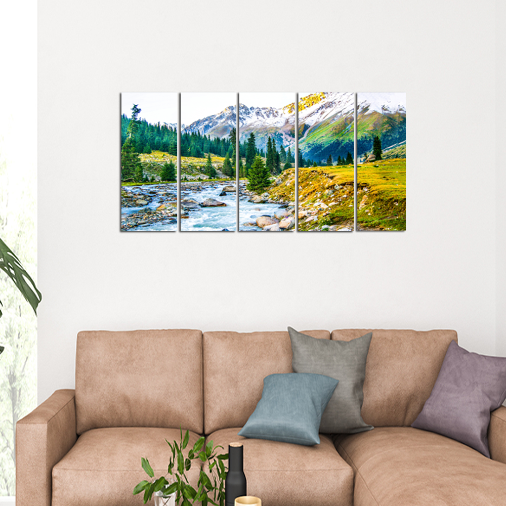 Mountain Tree & Water Scenery Canvas Wall Painting - With 5 Panel