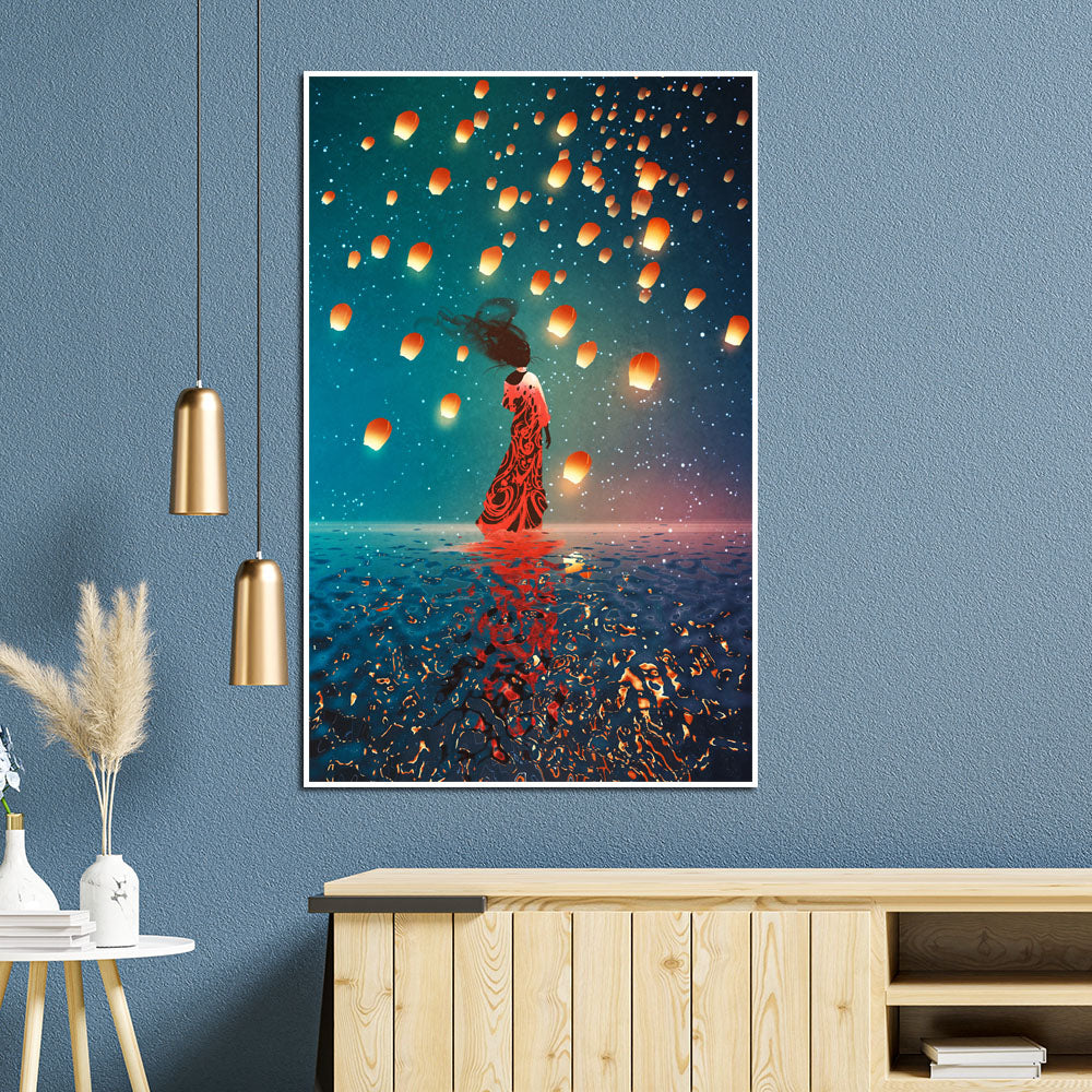 Girl With Sky Lanterns Floating Frame Canvas Wall Painting