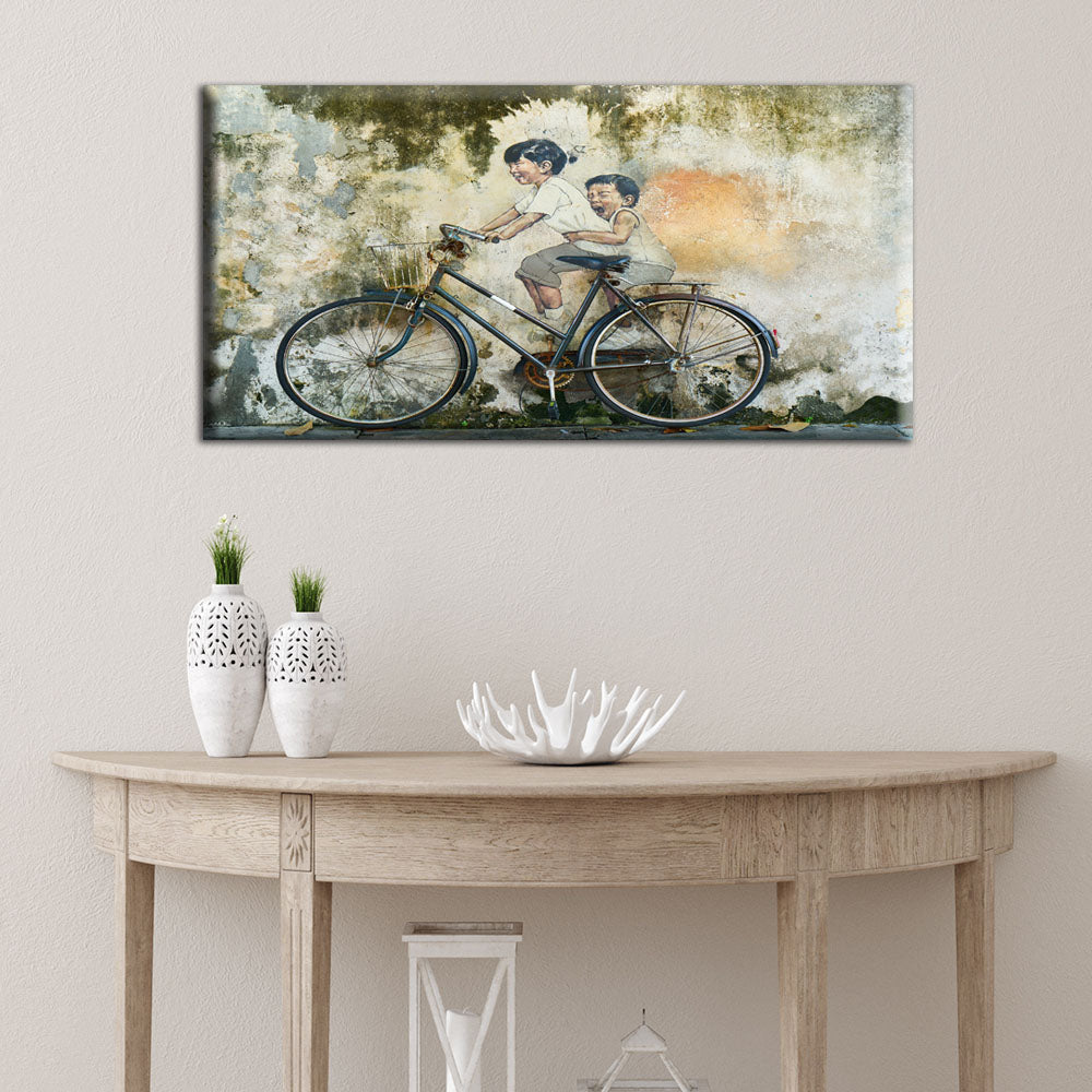 Kids On Old Bicycle Artistic View Canvas Wall Painting