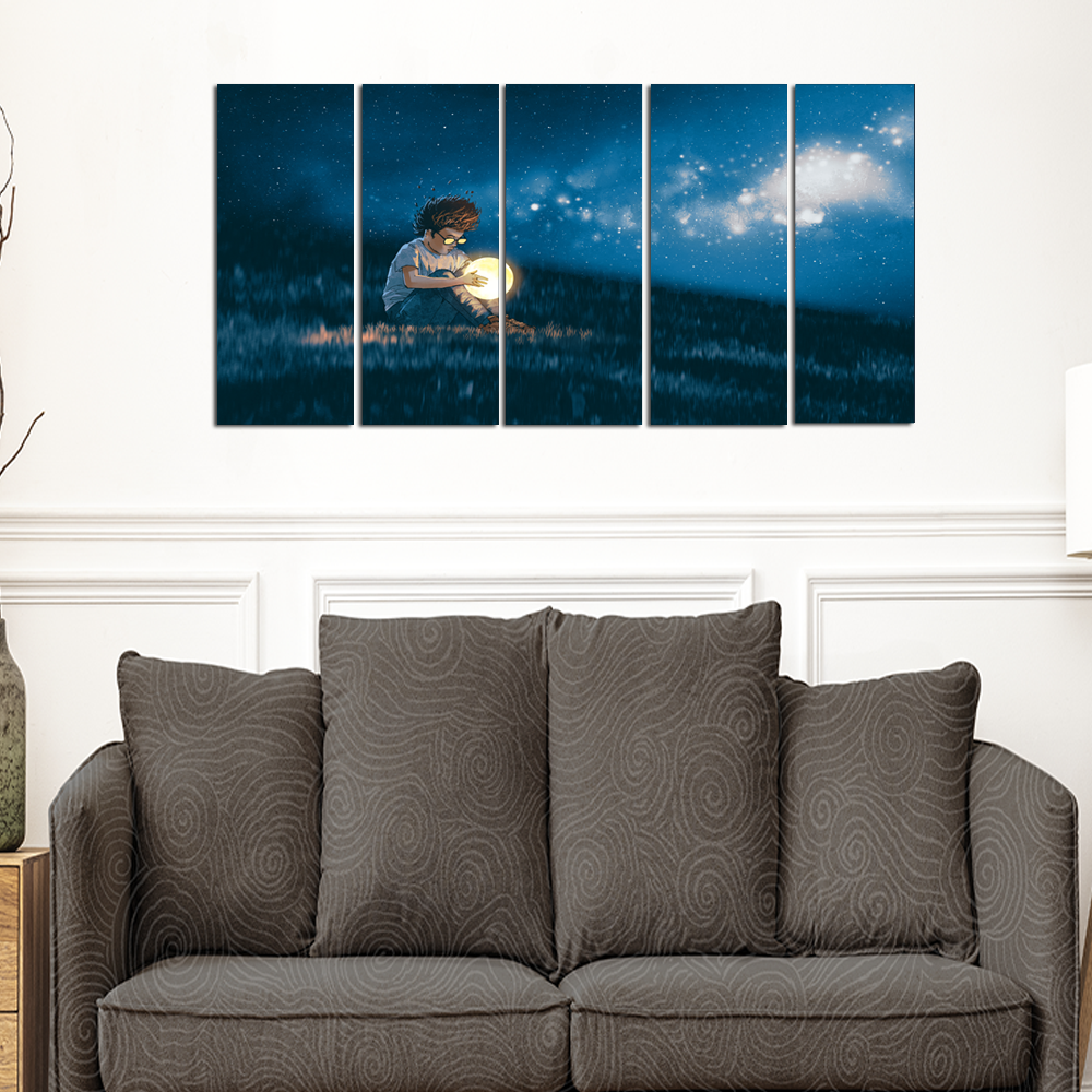 Boy With A Moon Light Ball In Hand Canvas Wall Painting - With 5 Panel