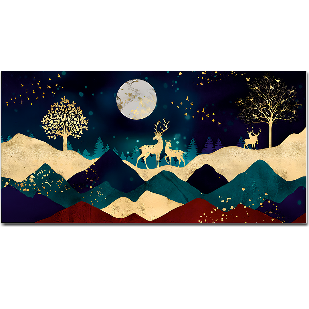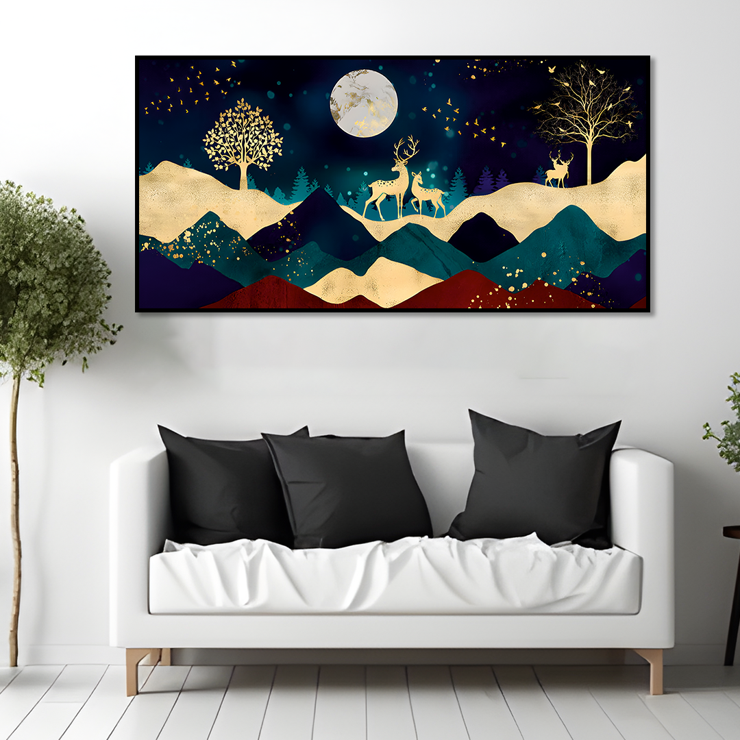 Luxurious Modern Art of Mountains and Golden Deer Tropical leaves Canvas Floating Frame Wall Painting is a symbol of peace & prosperity. Fall in love with this beautiful and designer wall painting as a part of your home decor. Available in three canvas colors, it is a perfect living room painting that can completely change the look of your home. It is mounted on a strong and robust wooden frame which is made of American Pine thereby making it resistant to bending at corners due to the constant pressure of hanging on the wall. These canvas wall art are printed in HD quality and also use Eco-friendly inks that leave no residue or fumes in the environment around where it is put.