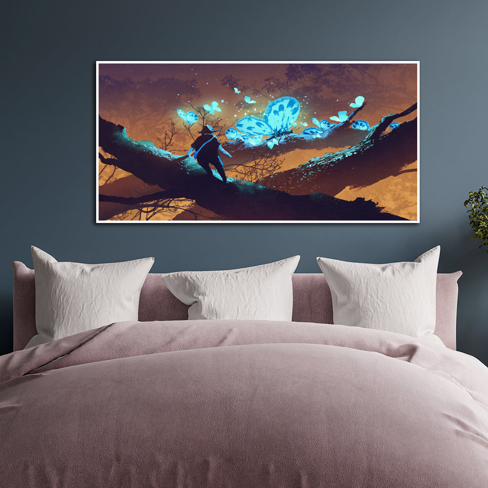 Man Looking at Blue Butterflies Canvas Floating Frame Painting