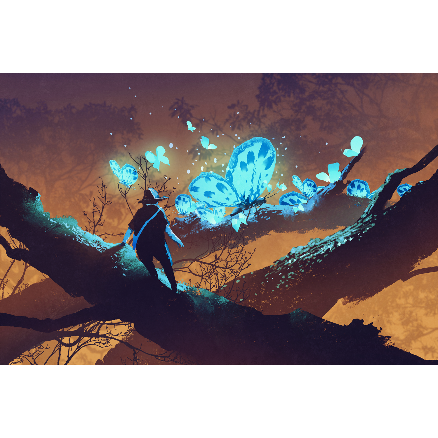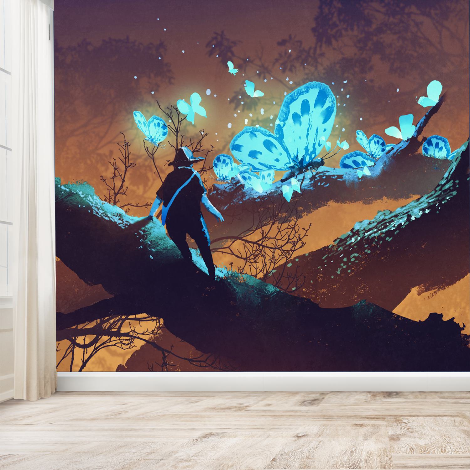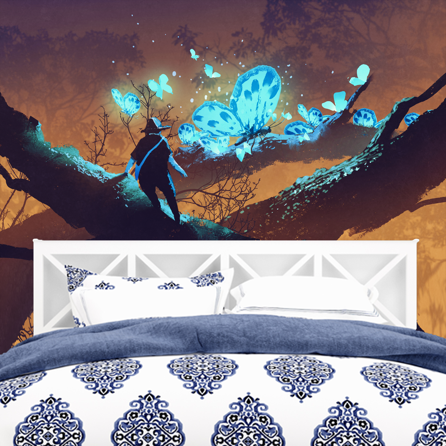 Man looking at Blue Butterflies Digitally Printed Wallpaper