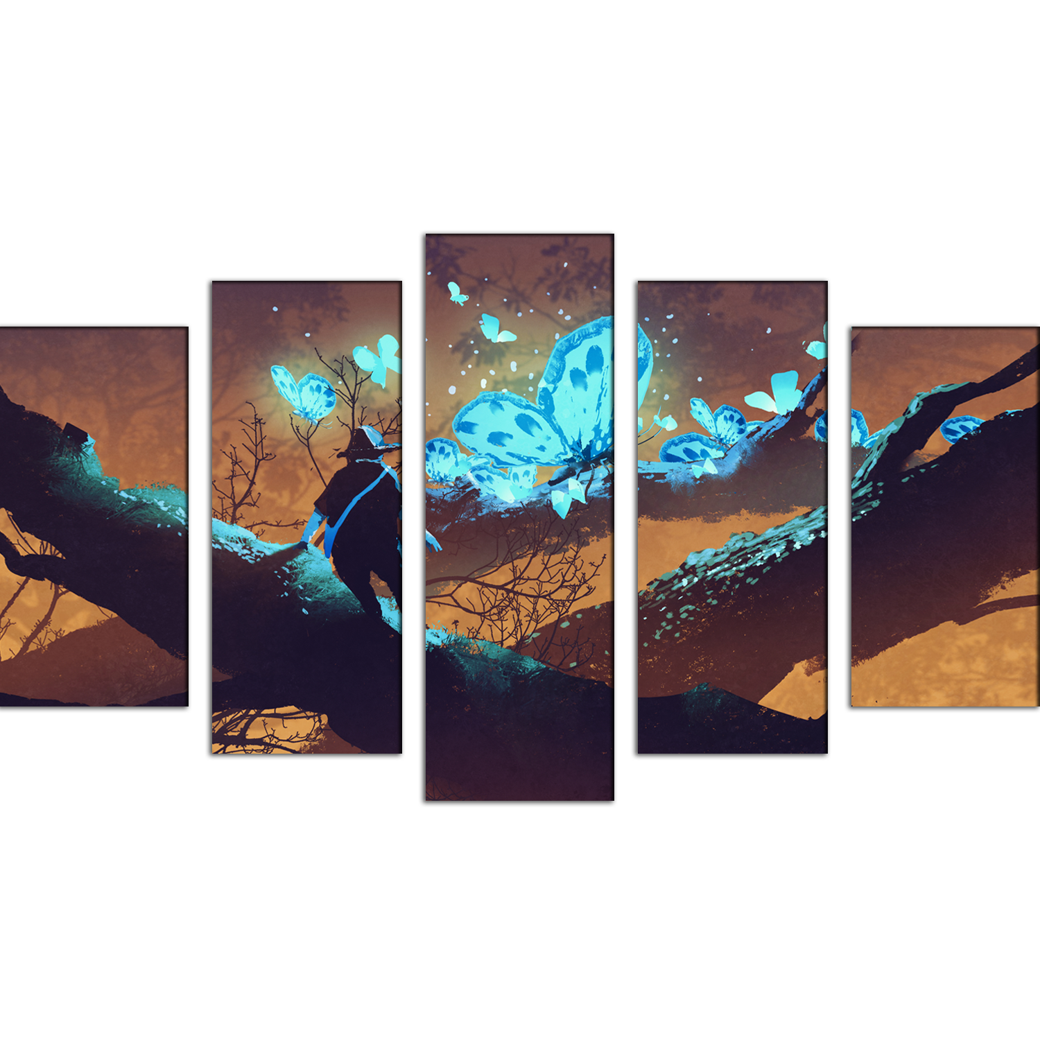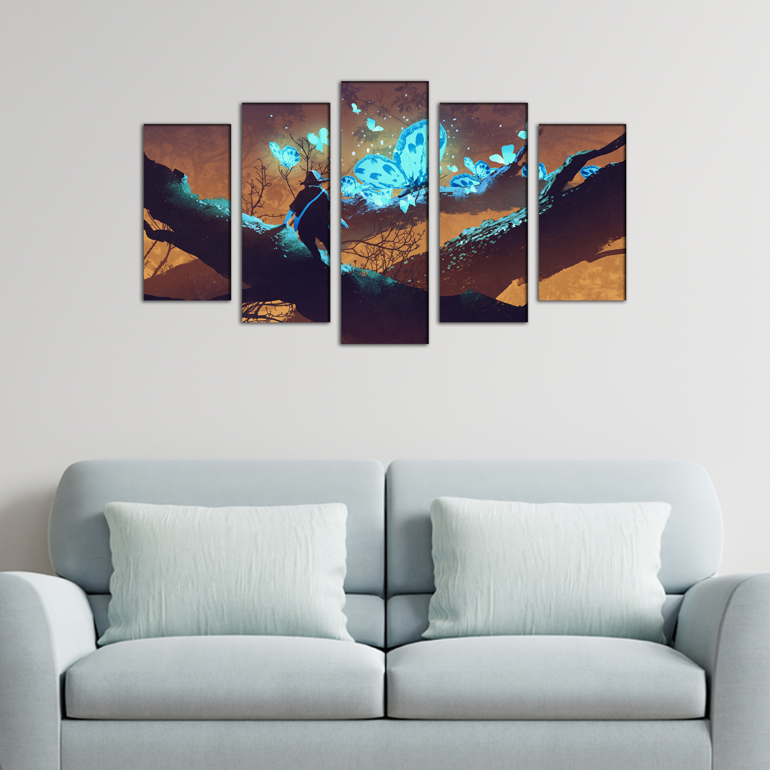 Man Looking at Blue Butterflies Canvas Wall Painting- With 5 Frames