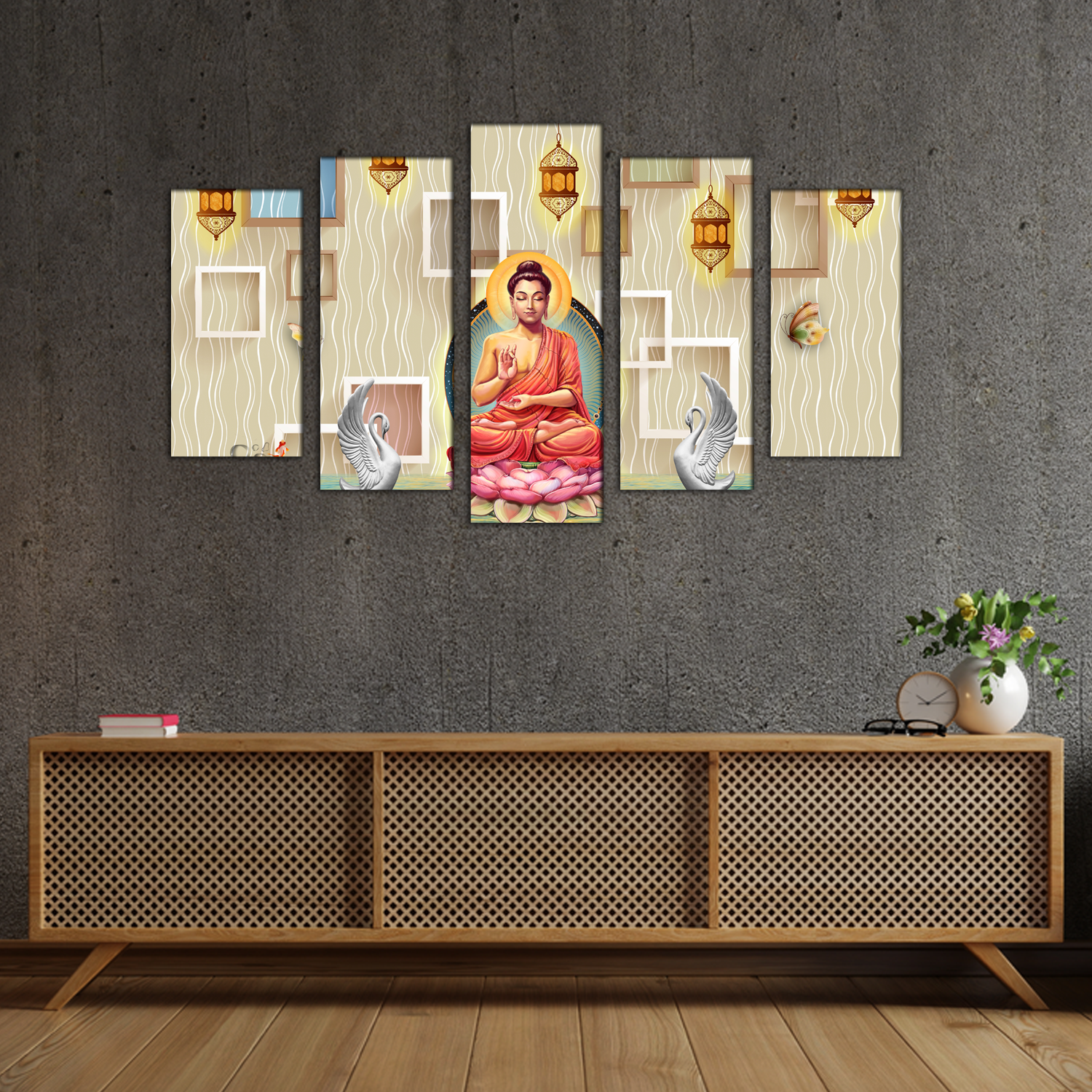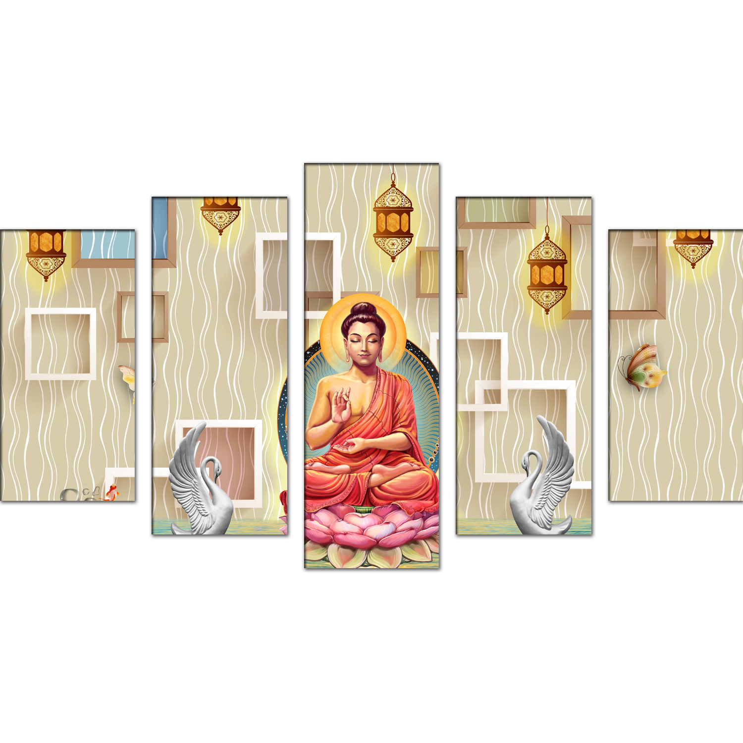 Buddha On Lotus With Swans Canvas Wall Painting- With 5 Frames