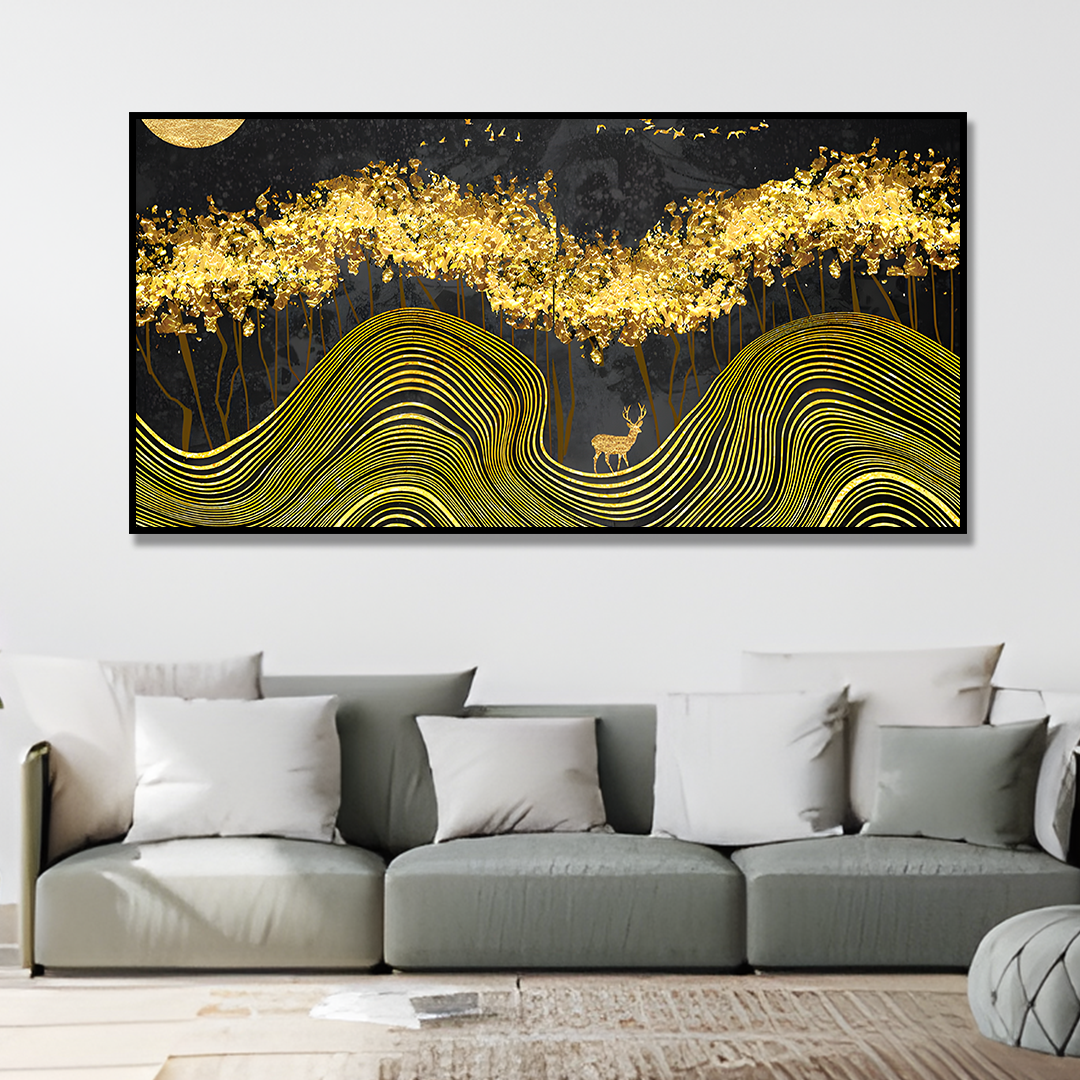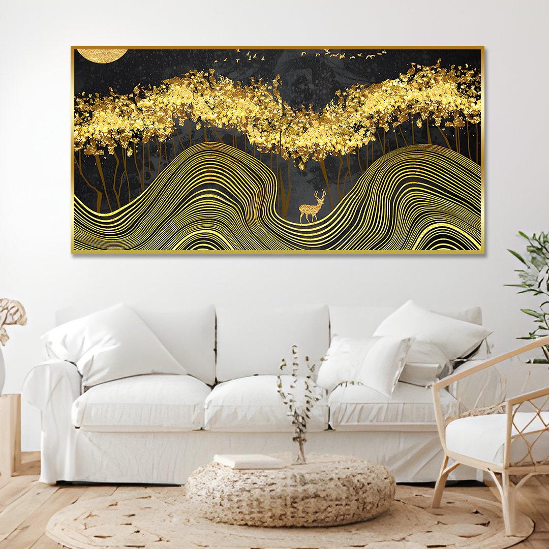 Miraculous Landscape with Golden Deer Texture Canvas Floating Frame Wall Painting is a symbol of peace & prosperity. Fall in love with this beautiful and designer Buddha wall painting as a part of your home decor. Available in two canvas colors, it is a perfect living room painting that can completely change the look of your home. It is mounted on a strong and robust wooden frame which is made of American Pine thereby making it resistant to bending at corners due to the constant pressure of hanging on the wall. These canvas wall art are printed in HD quality and also use Eco-friendly inks that leave no residue or fumes in the environment around where it is put.