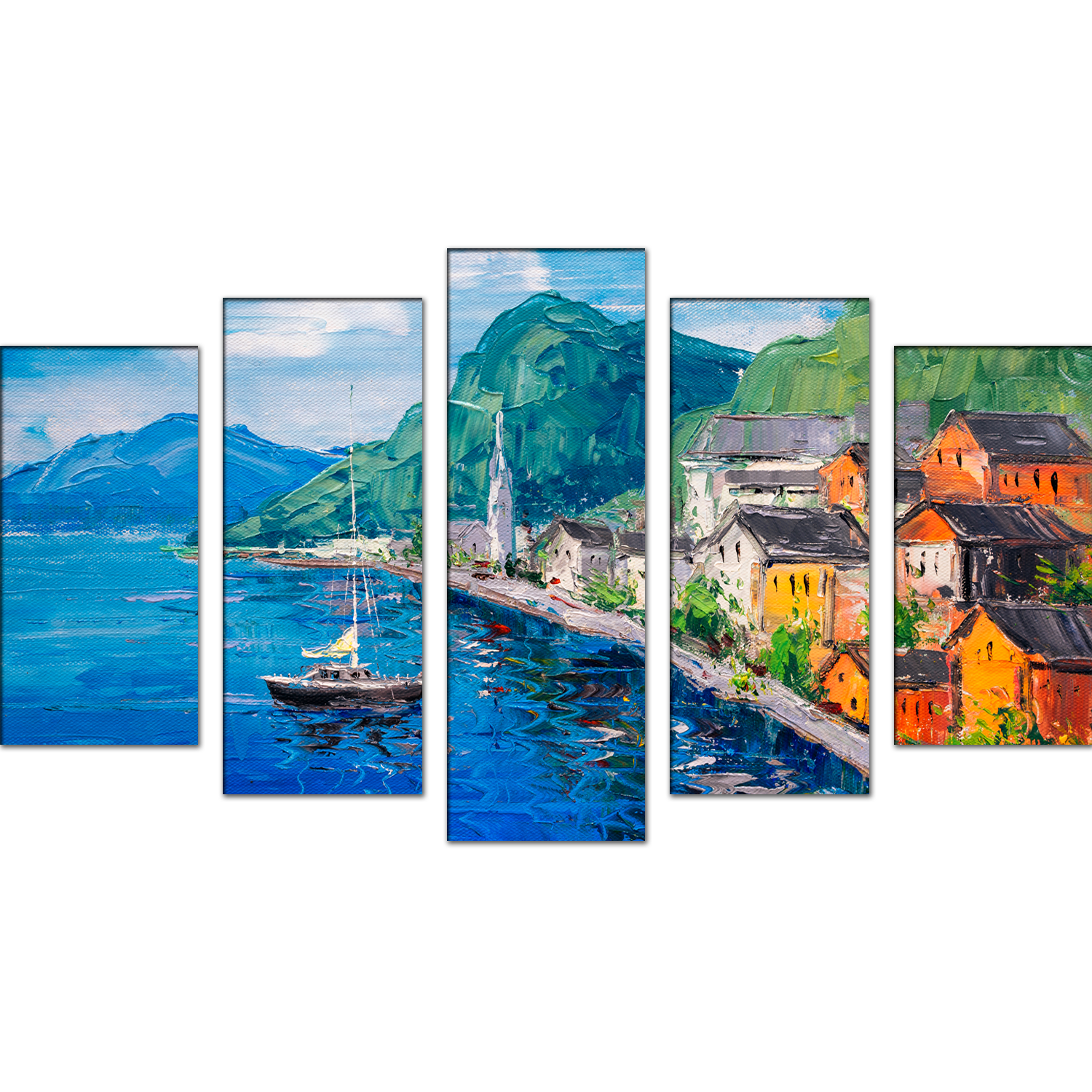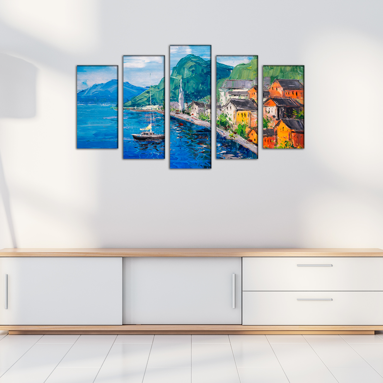 Mountains Near Blue Lake Artistic Scenery Canvas Wall Painting- With 5 Frames