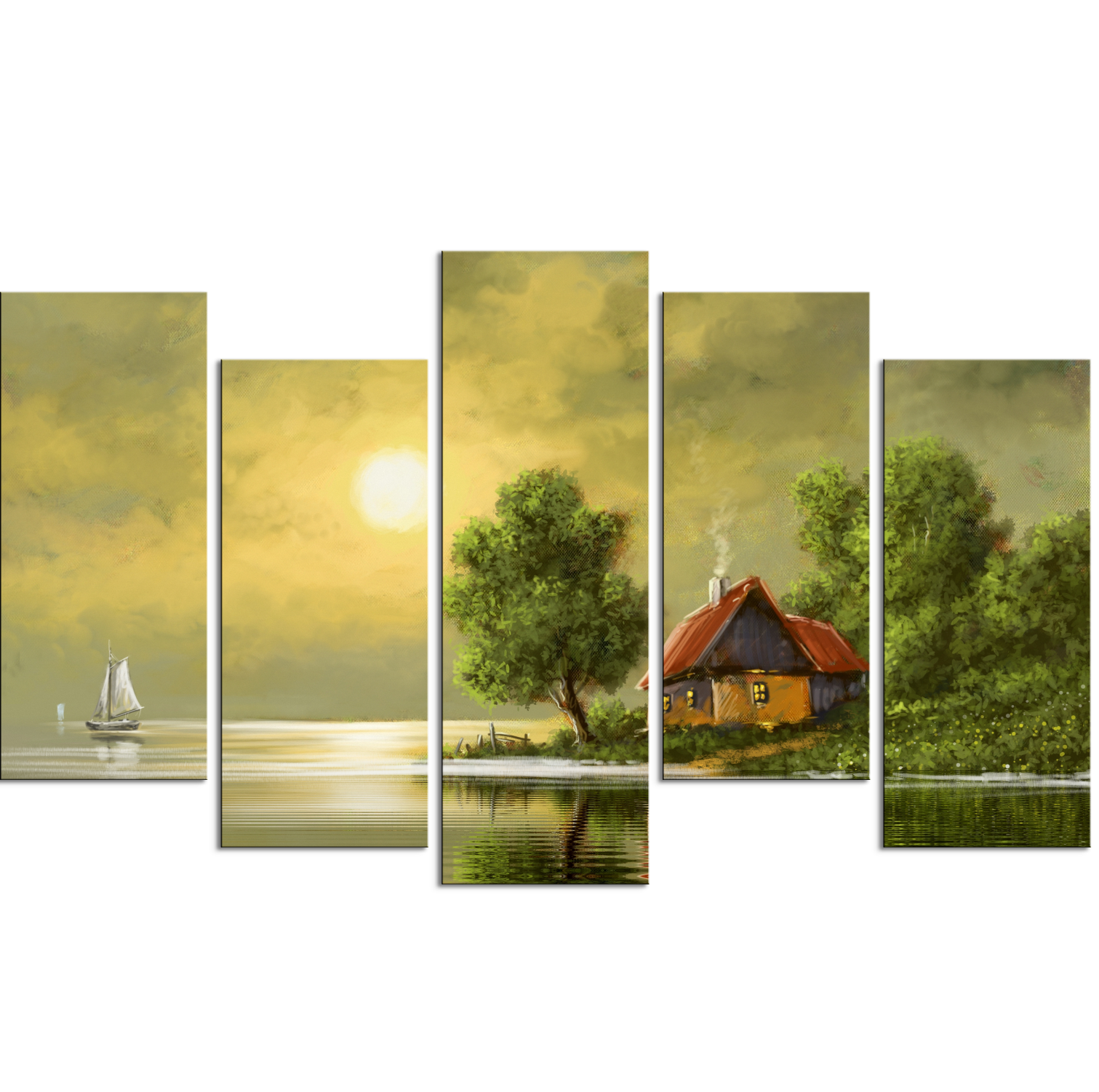 Beautiful Sunset In Village Canvas Wall Painting- With 5 Frames