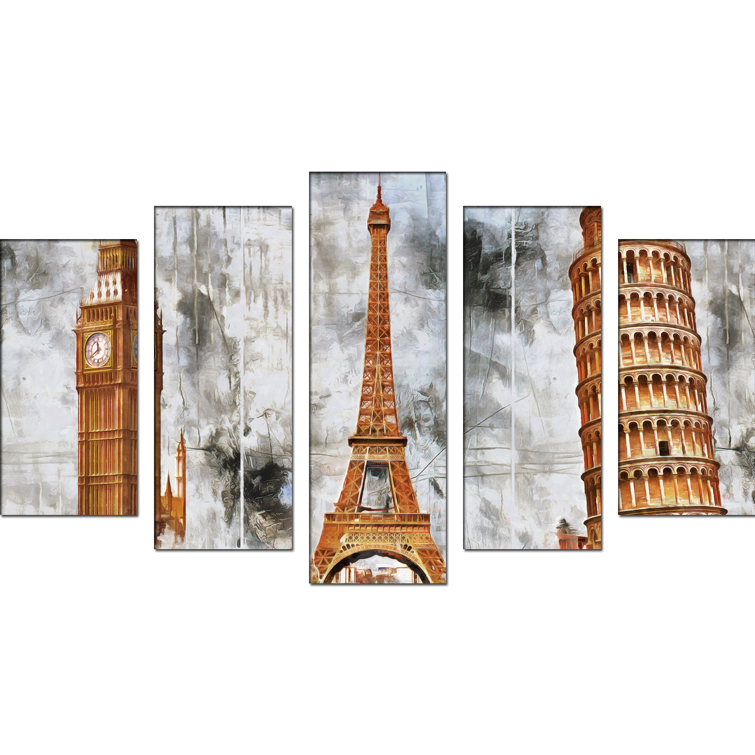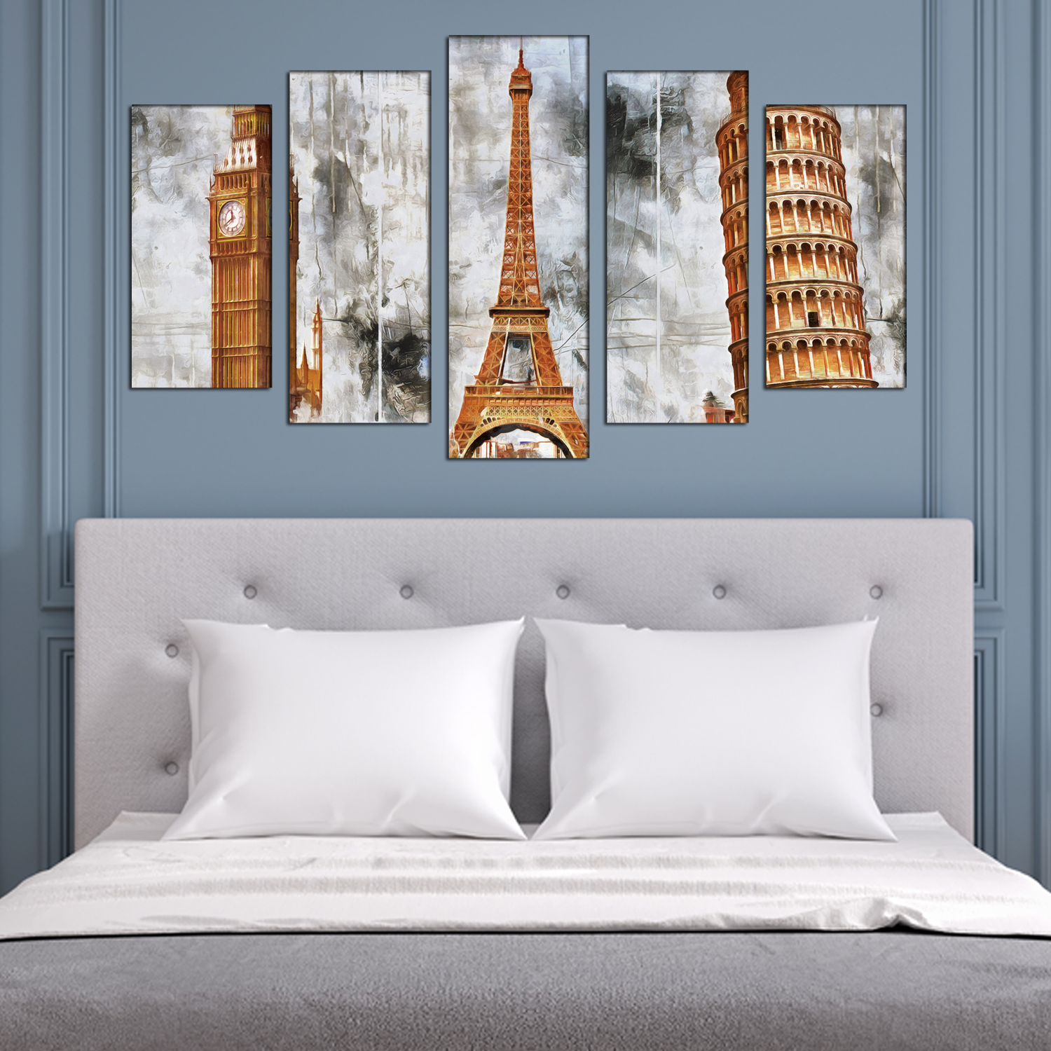 Eiffel Tower, Big Ben And Tower Of Pizzal Canvas Wall Painting- With 5 Frames