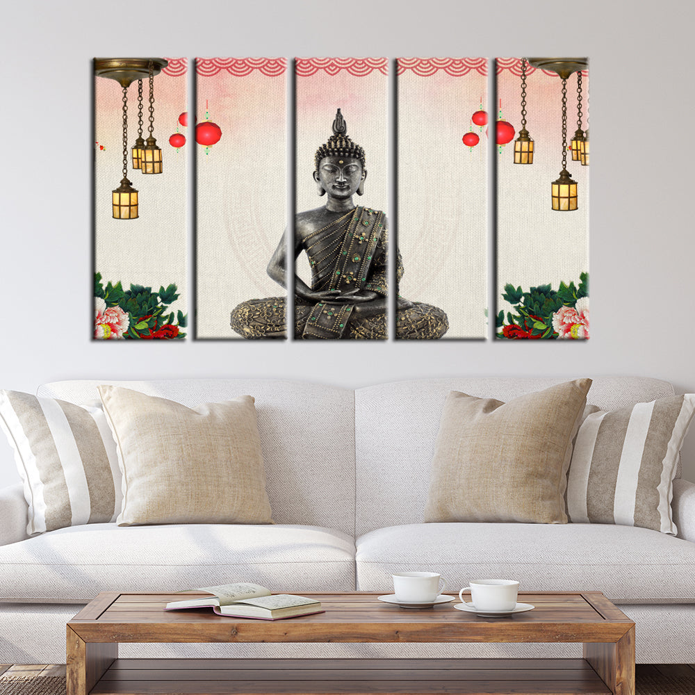 Buddha With Decorative Background Wood Framed Canvas Printed Wall Painting- With 5 Frames