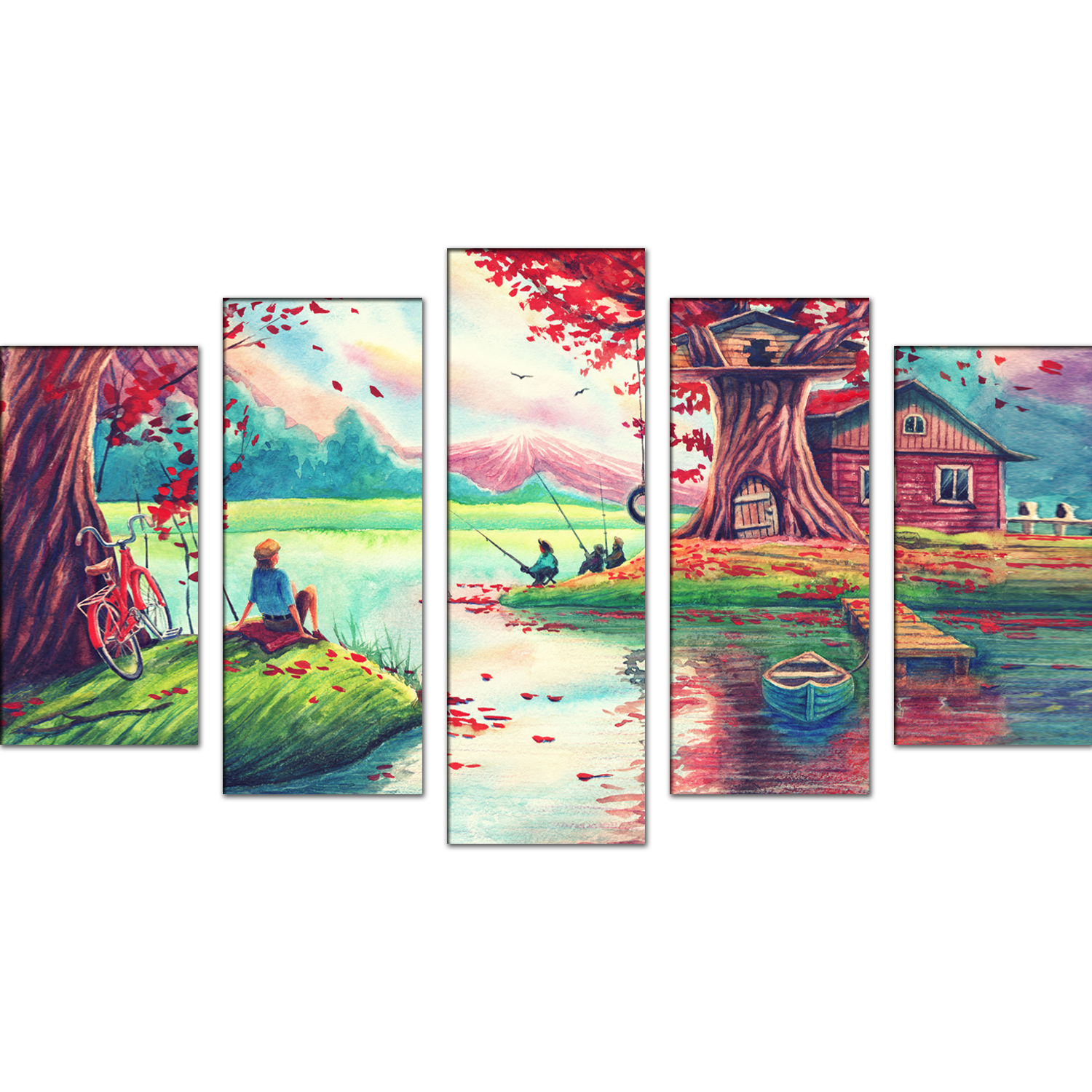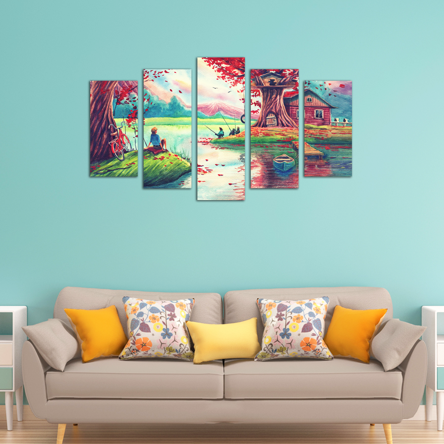 Oil Painting Village Scenery Canvas Wall Painting- With 5 Frames
