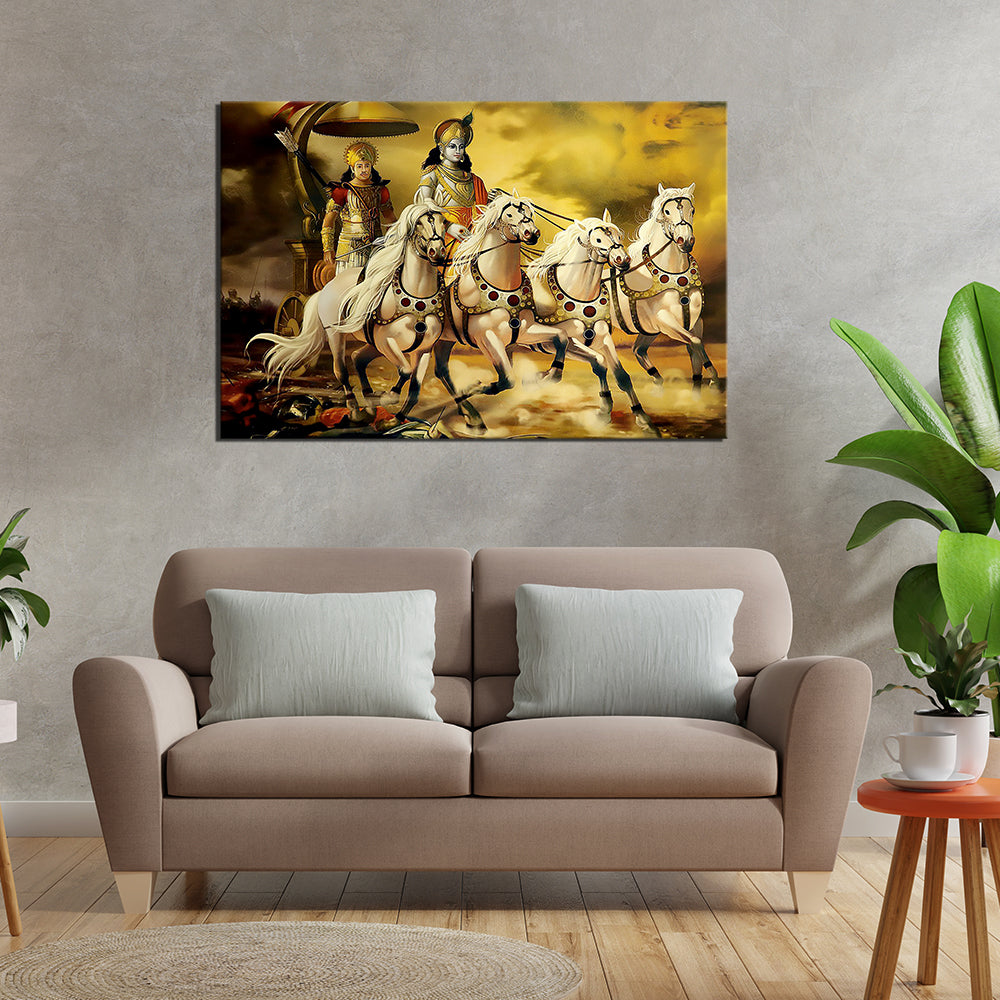 Sri Krishna and Arjuna Gita Wall paintings can be master art pieces that will add charm to your home decor. This Mahabharata painting is epic and can add a different look to your interiors. If you are a devotional person, this is a perfect piece of canvas wall art for you. Enjoy the freshness and uniqueness of these wall paintings with HD print quality, 6-color printing technology, and solvent-based & latex-free printing which make it safe for the air around you and the environment as a whole. Using a 6-color HP inkjet printing technology, the canvas wall art comes fresh and alive and looks more lively to add charm to your existing decor. The water-based chemical-free printing ink makes these wall paintings a classic example of a wall decor idea.