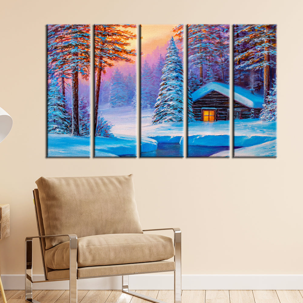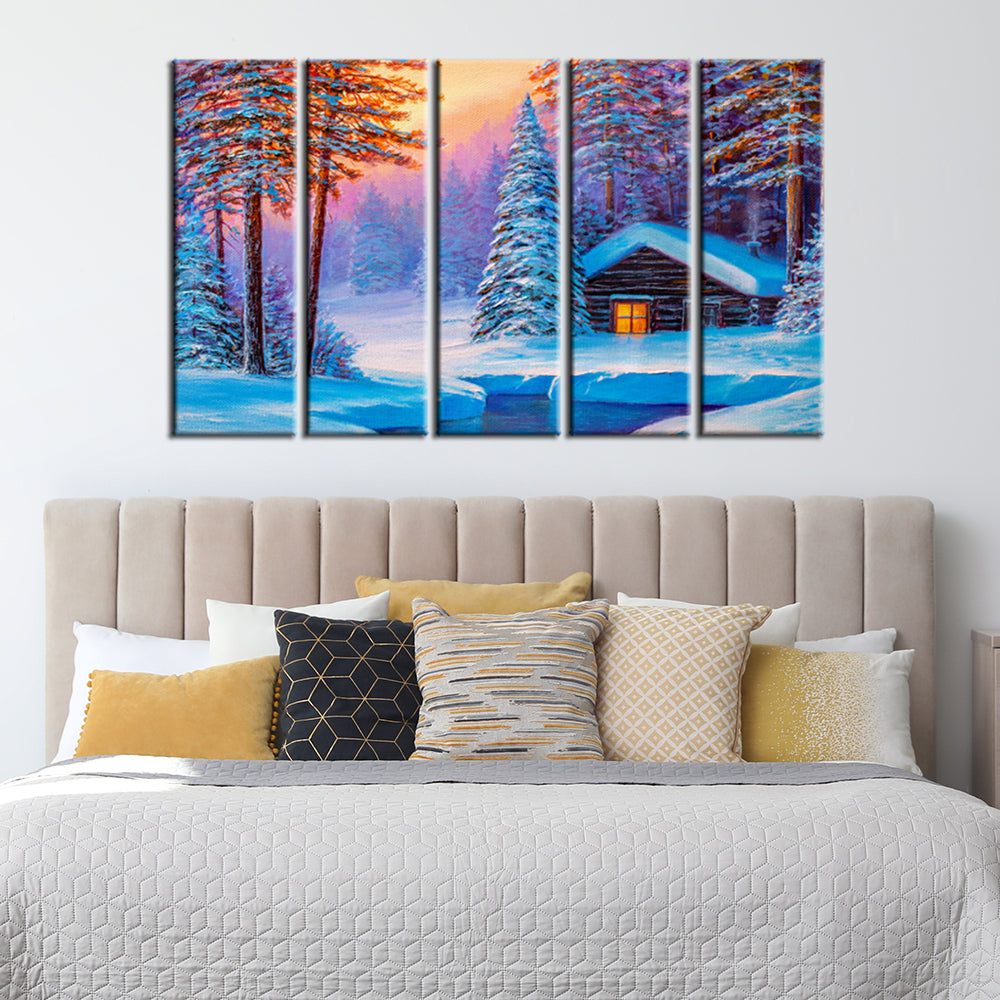 Cold Winter Sunrise Scenery Canvas Wall Painting- With 5 Frames