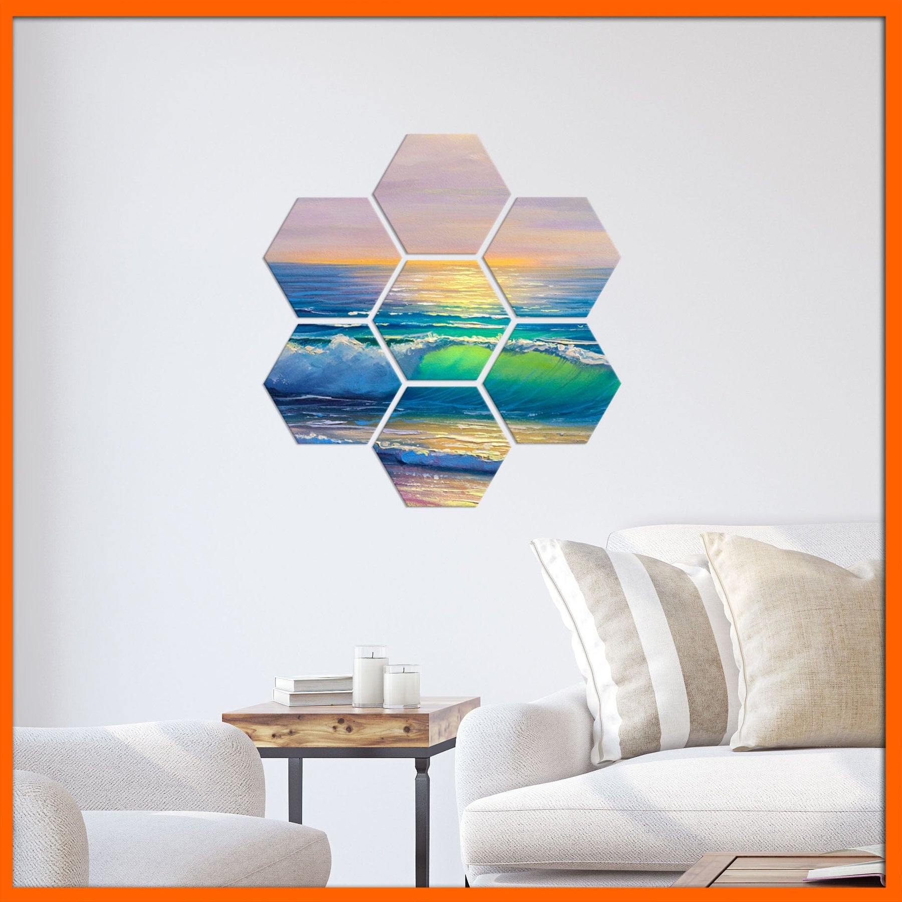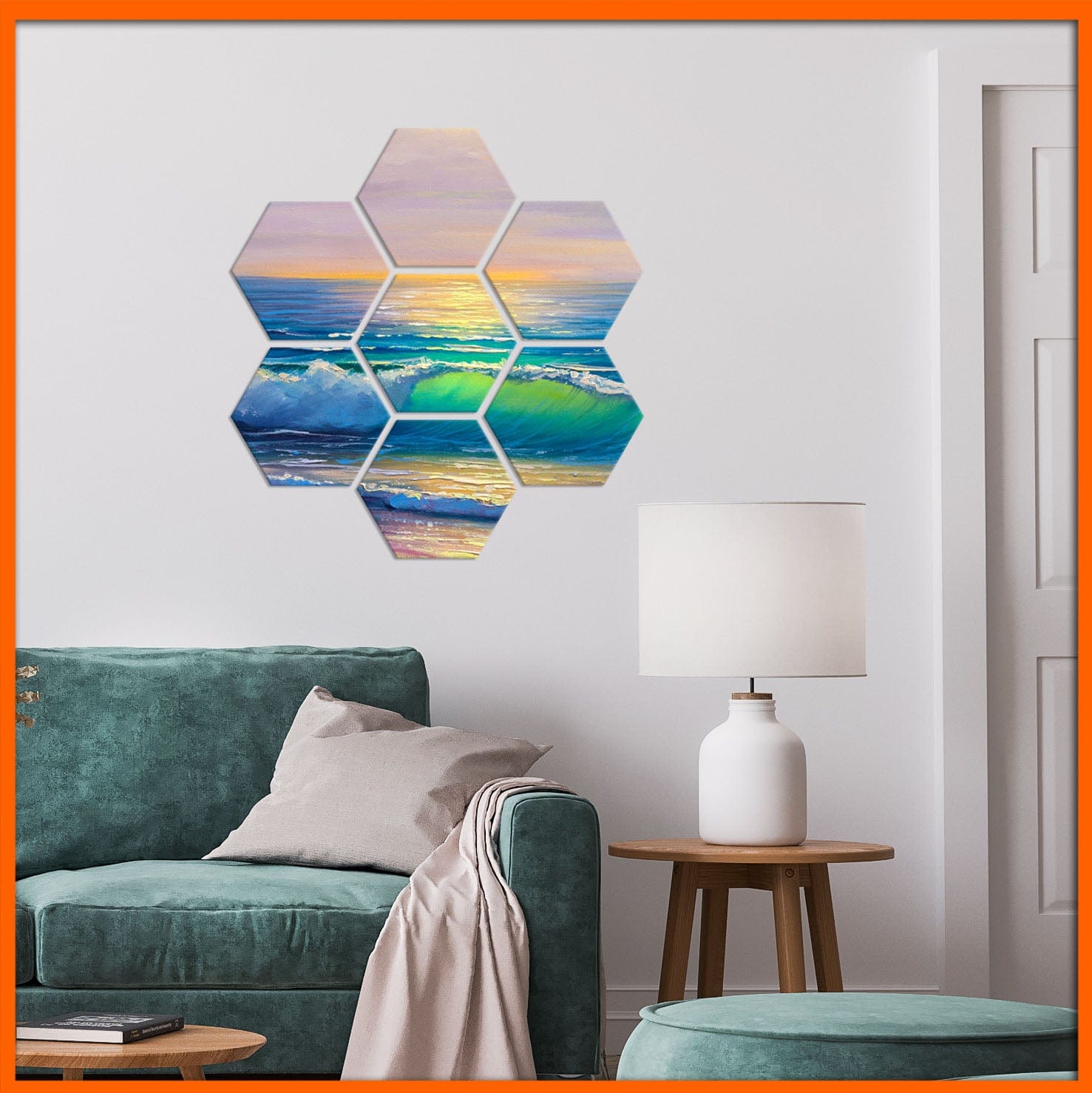 - Keep the painting’s nature in your mind and decide on which wall you can hang this hexagonal painting. For instance, placing this sunset sky and waves in an artistic hexagon wall décor in your bedroom, living room, dining area, or office reception is better.