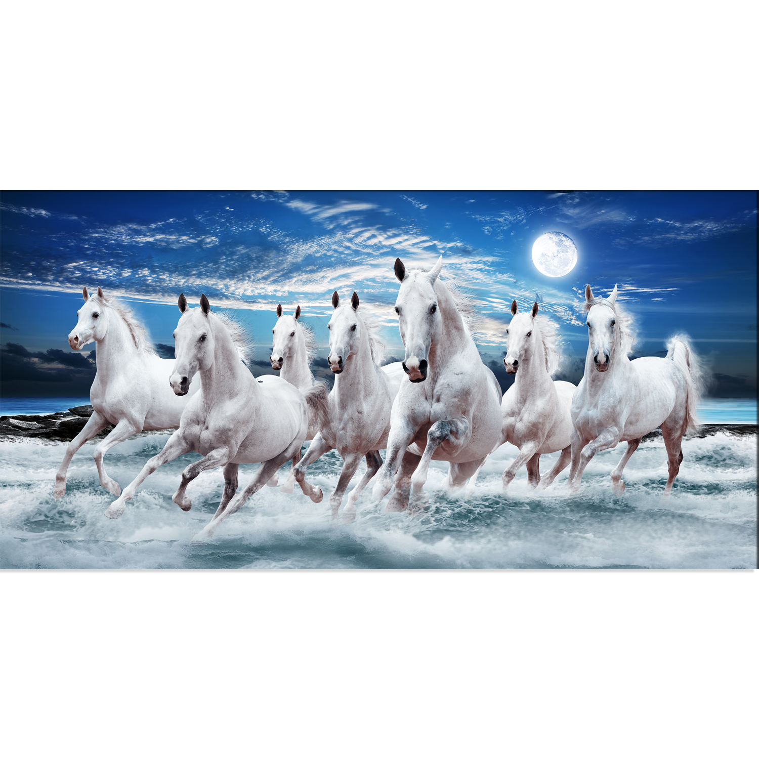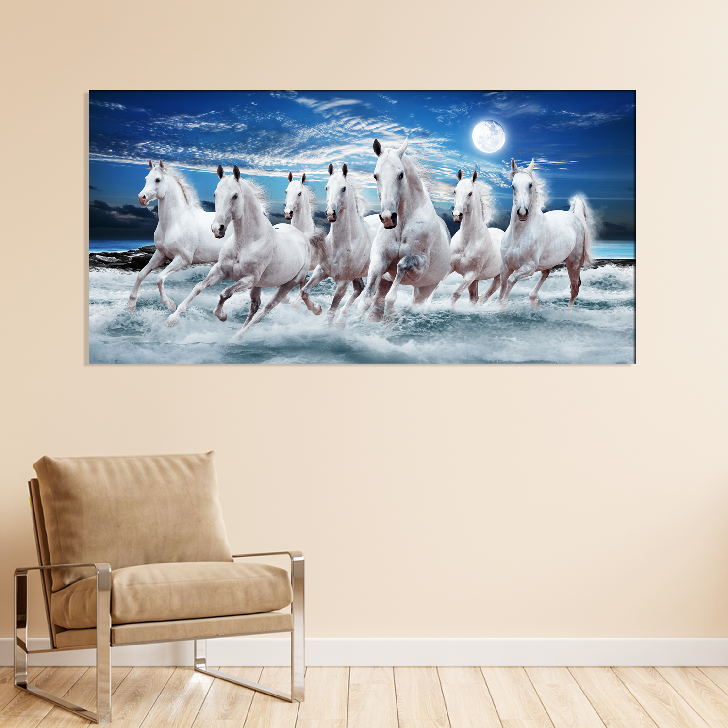 Home decor is incomplete without this carefully mounted floating canvas wall painting made using high-quality inkjet printing. Seven white horse wall painting running towards you is truly an example of progress in one’s life. DecorGlance paintings are made using ZERO solvents so, it is completely a safe install in your homes. Choose from amongst thousands of designer wall paintings being this white horse wall painting, the BESTSELLER of all times. Keep the environment sustainable and buy the best home decor collection from us!