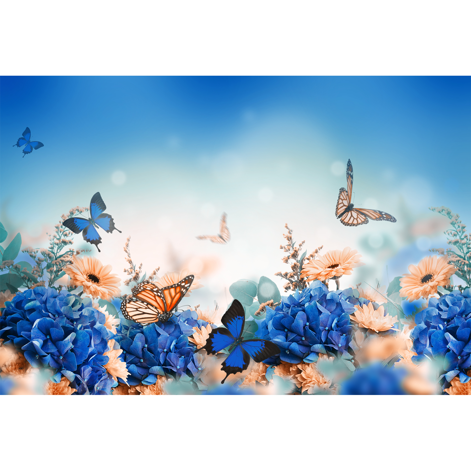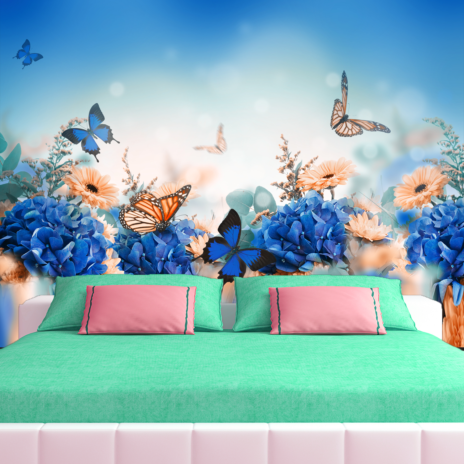 Blue Butterfly With Flower Digitally Printed Wallpaper