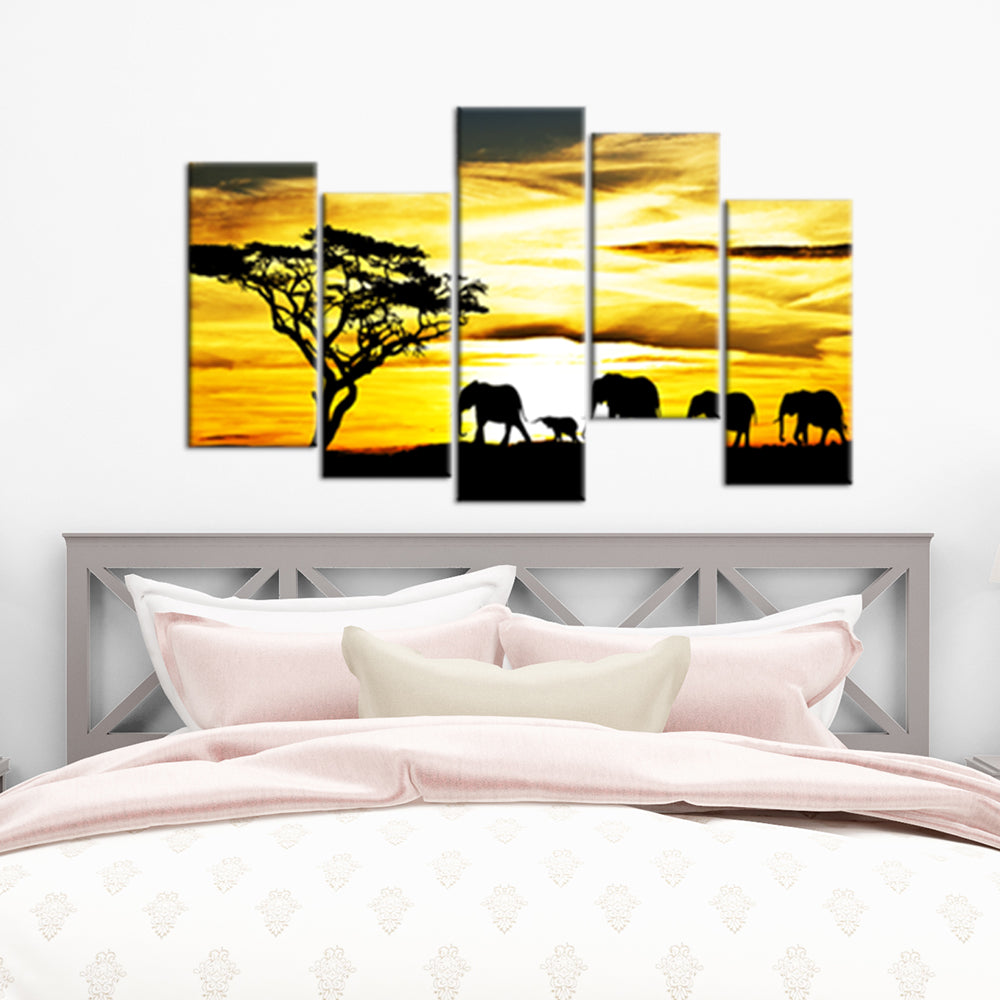 Beautiful View of Elephant Family Canvas Wall Painting- With 5 Frames